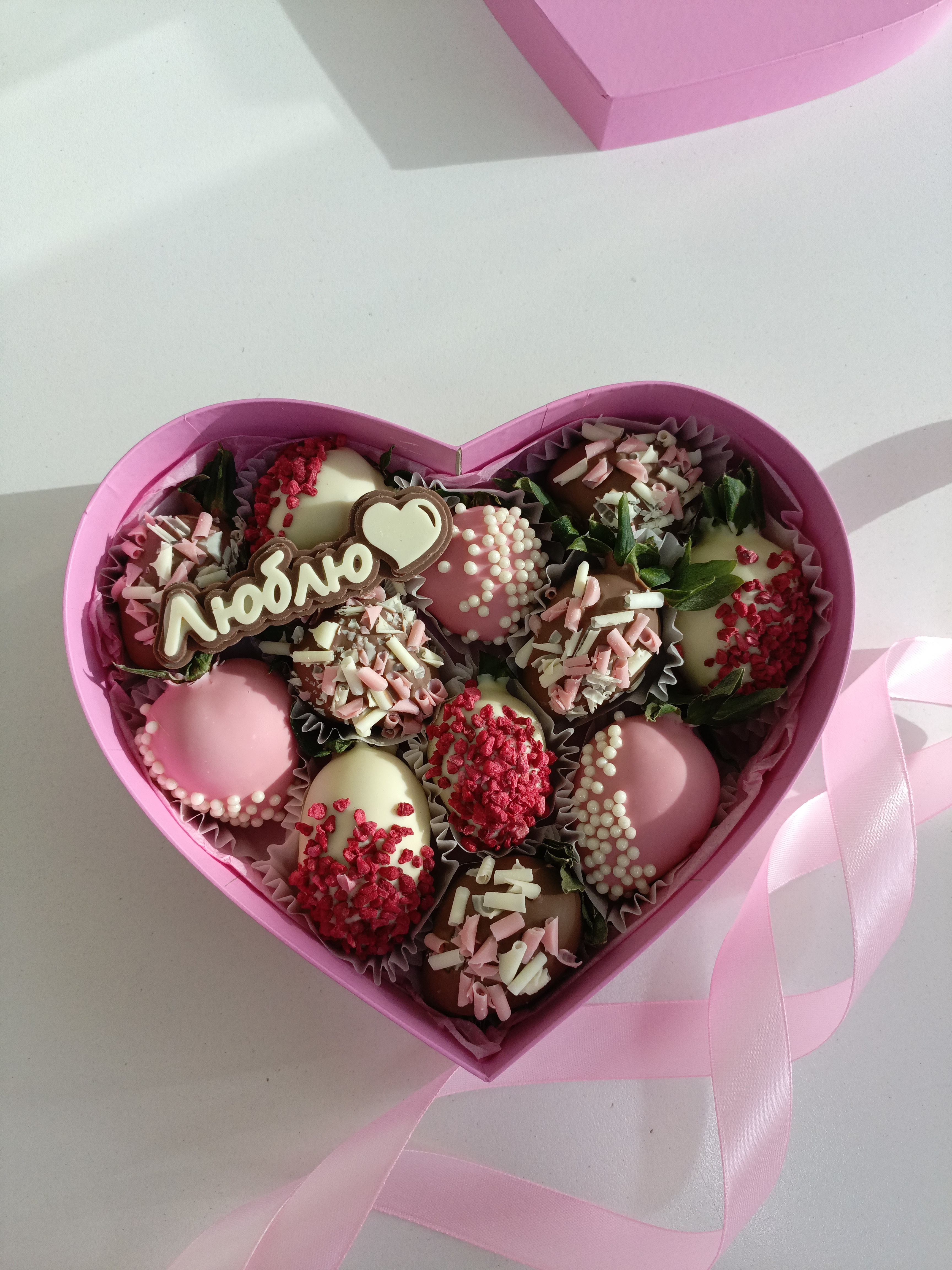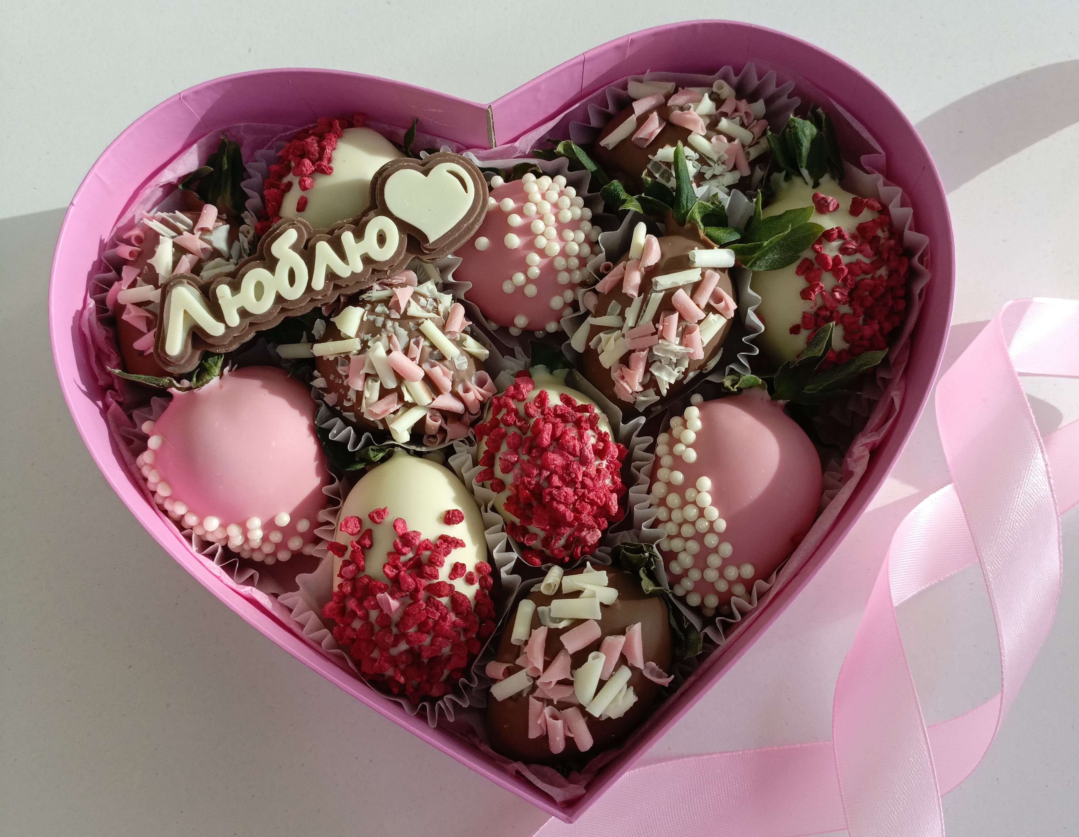 Сердце 20 см, клубника 10-12 штук, малина сублимированная, стружка шоколадная, рис воздушный бусинк.