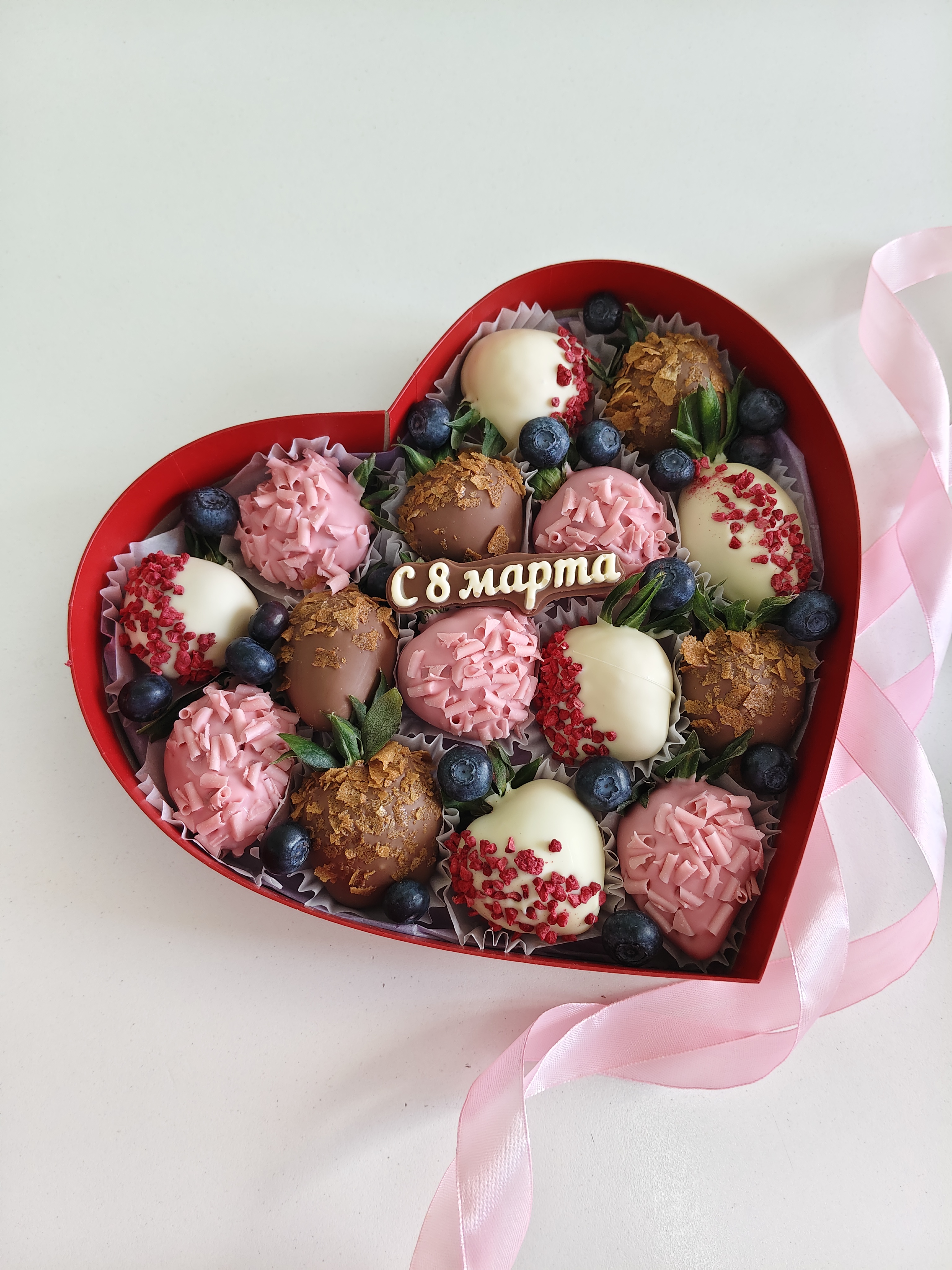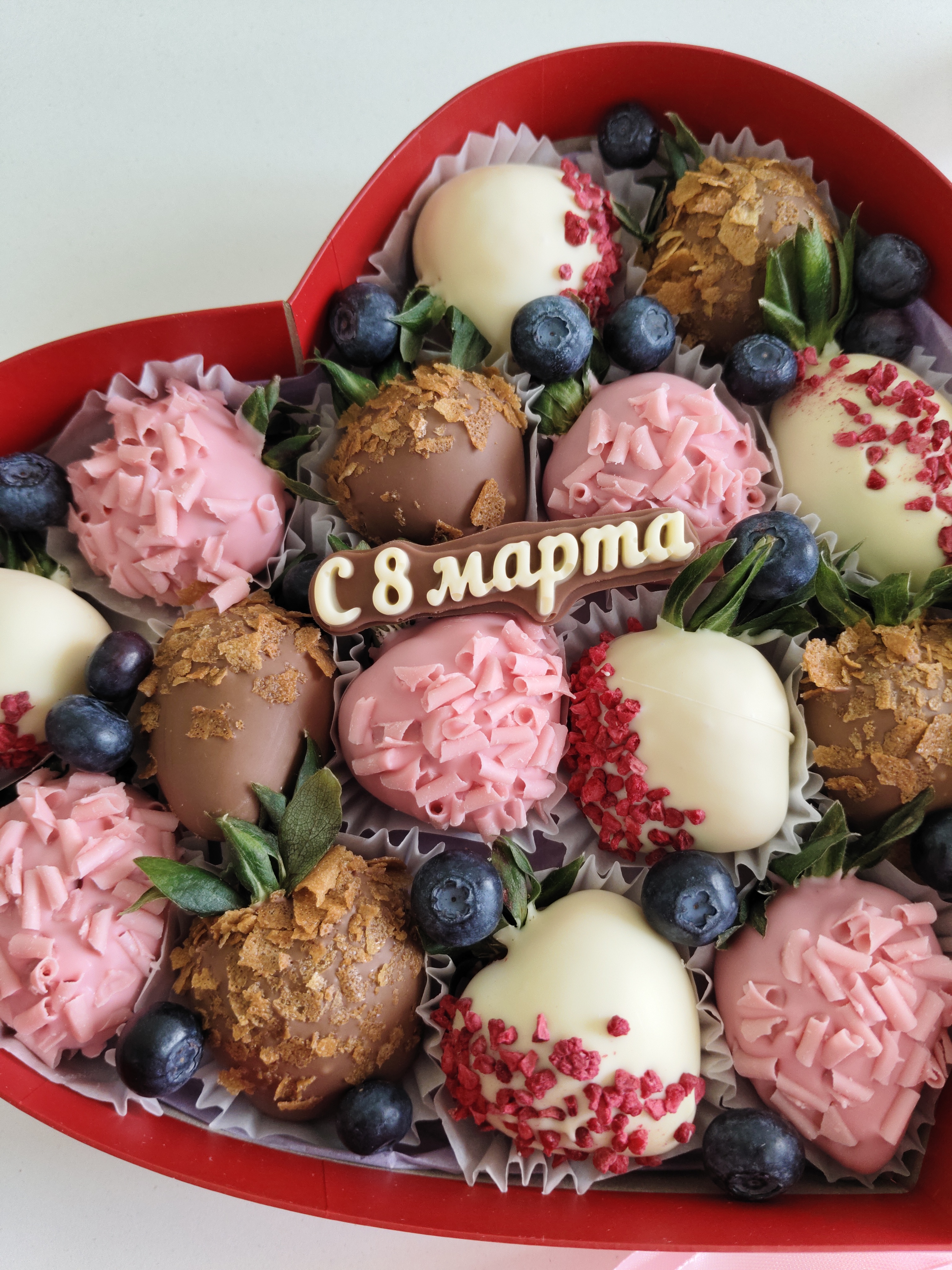 Состав: клубника свежая, вафля бельгийская, малина сублимированная, завитки шоколадные, голубика, табличка с 8 марта.