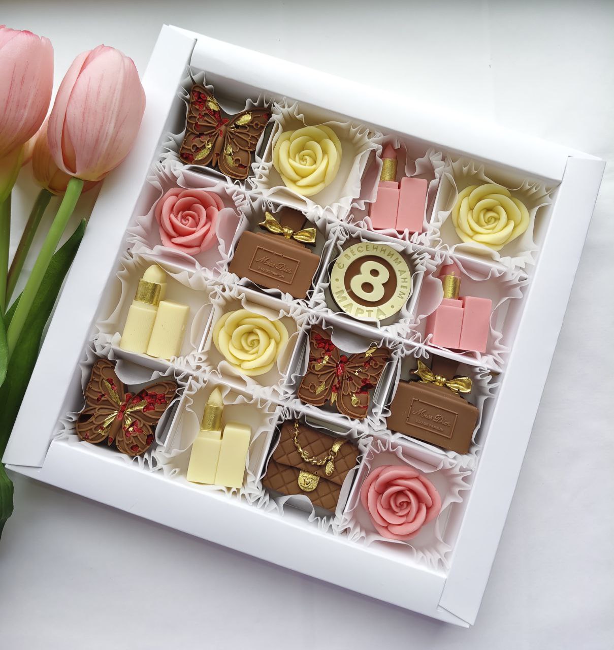 Ассорти молочного и белого шоколада с добавлением сублимированной малины, в виде разных фигурок и роз , подарит праздничное настроение!