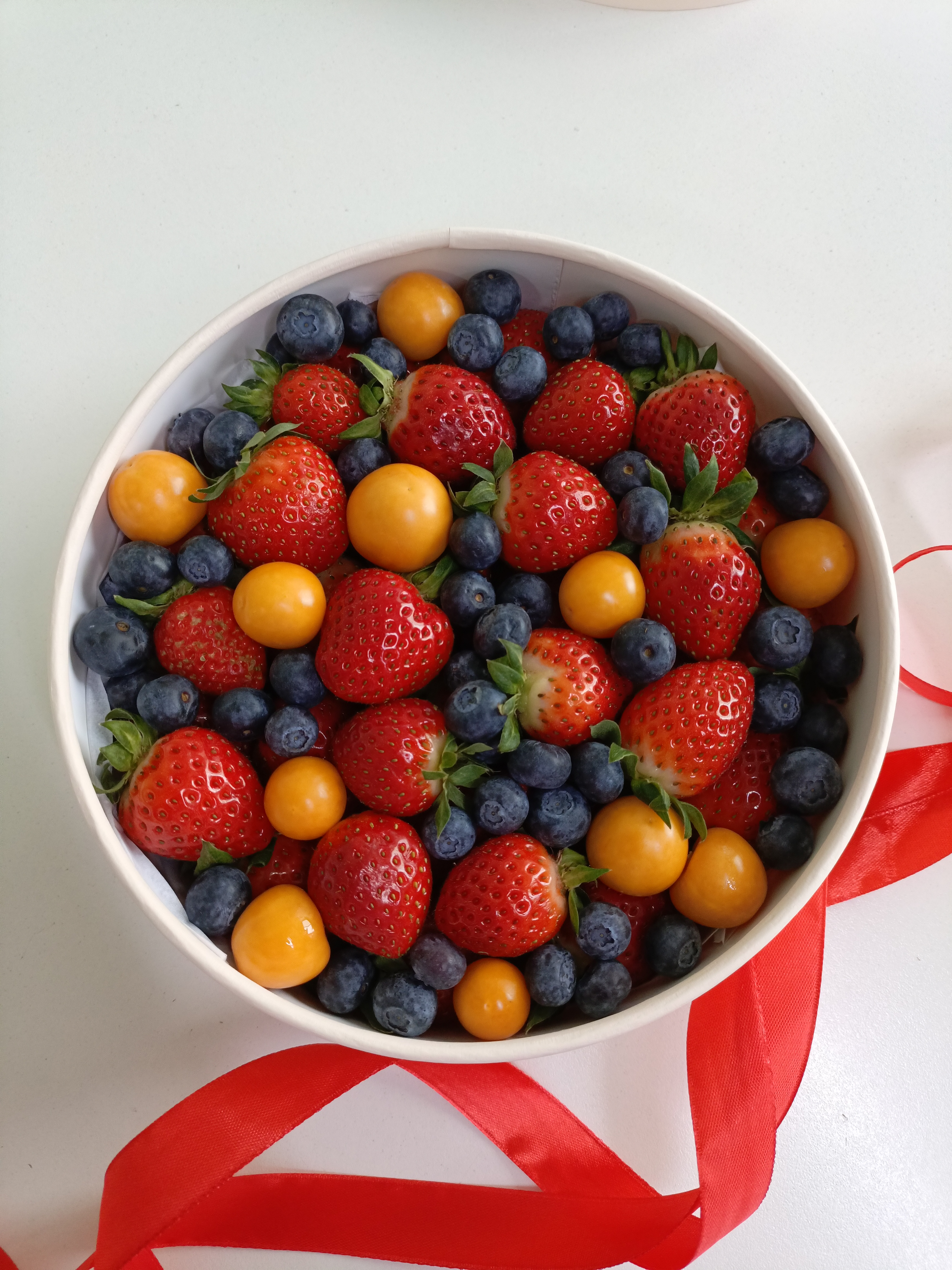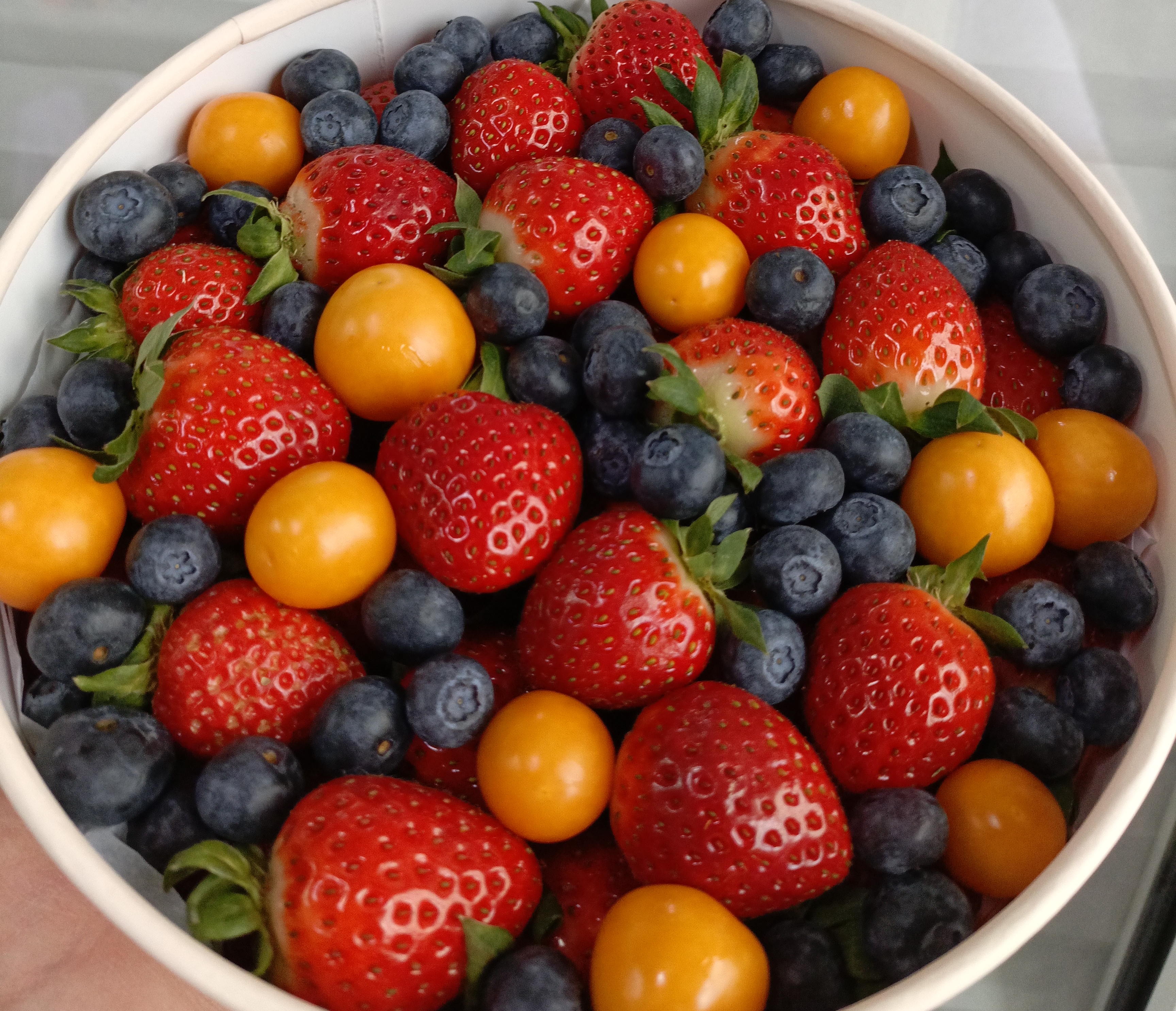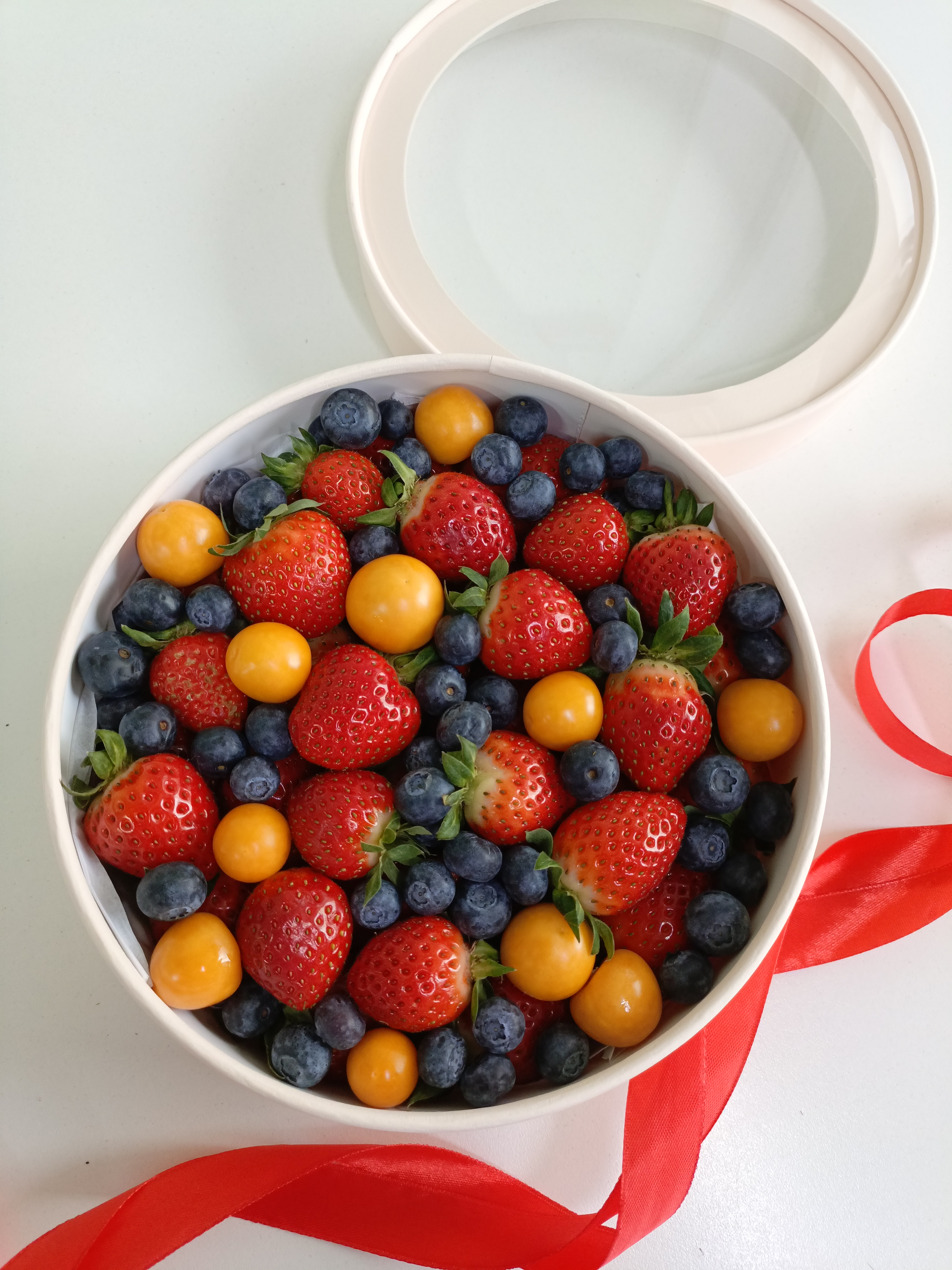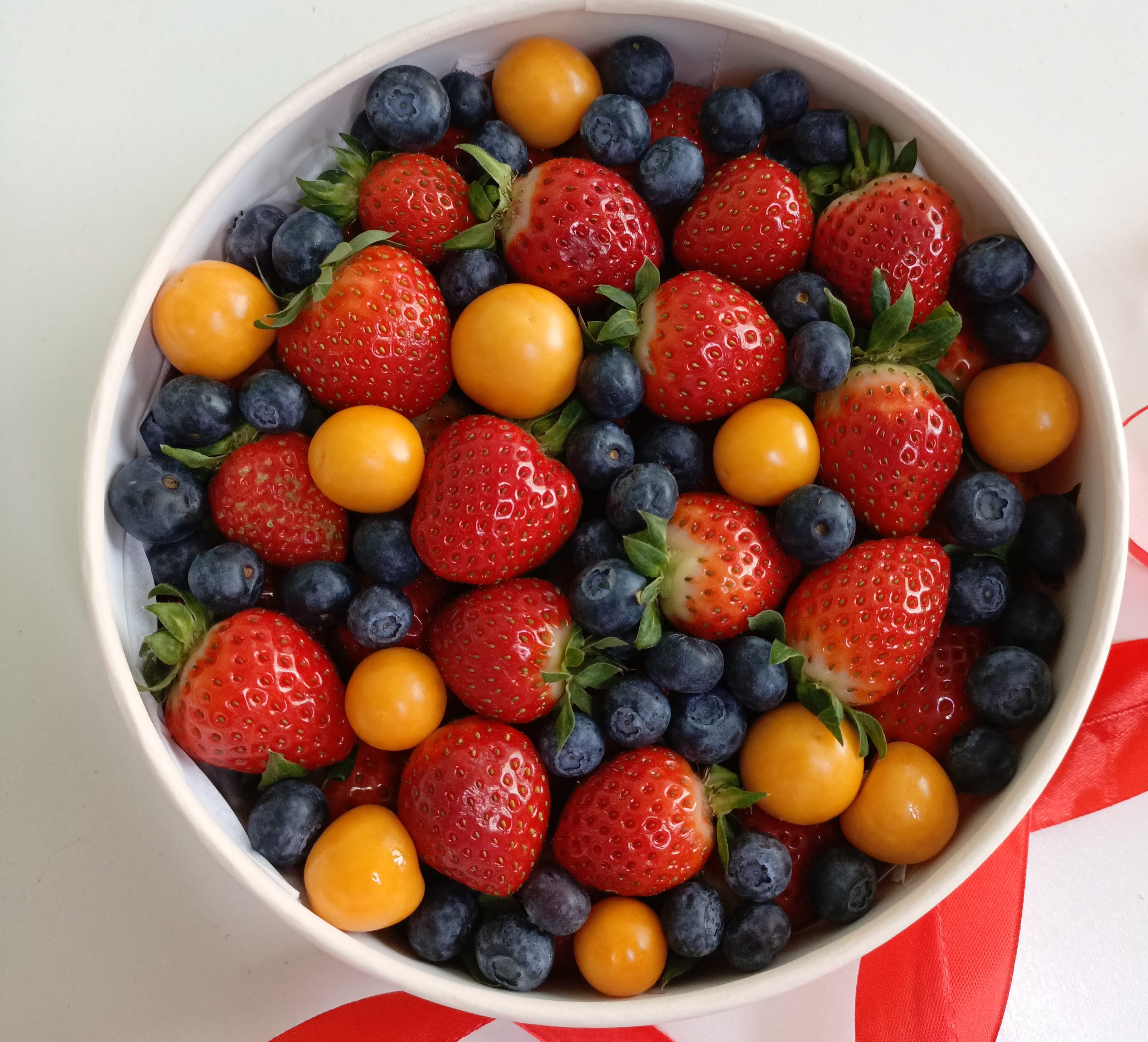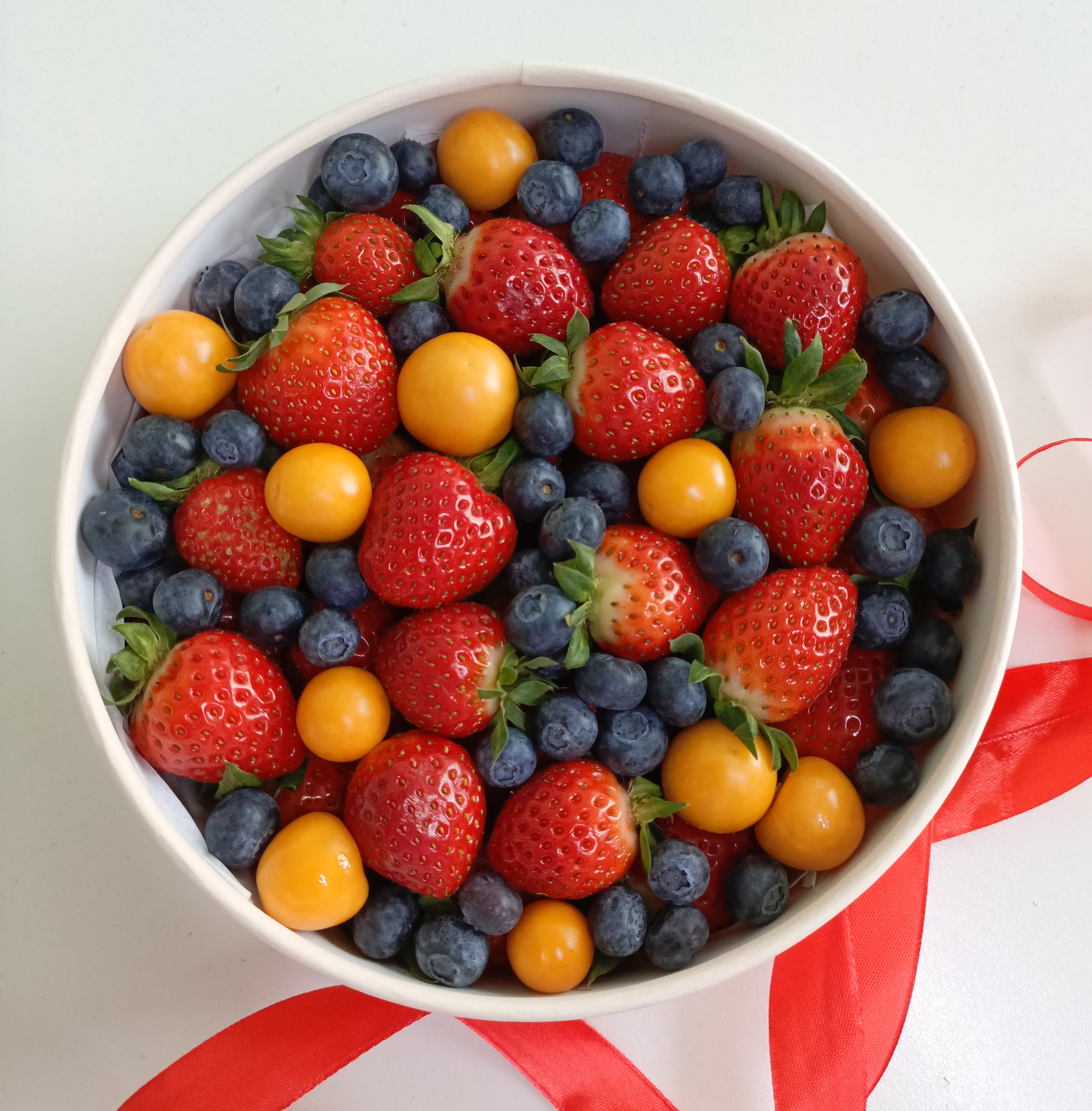 Ягодный набор из свежей клубники и ягод голубики и физалиса.