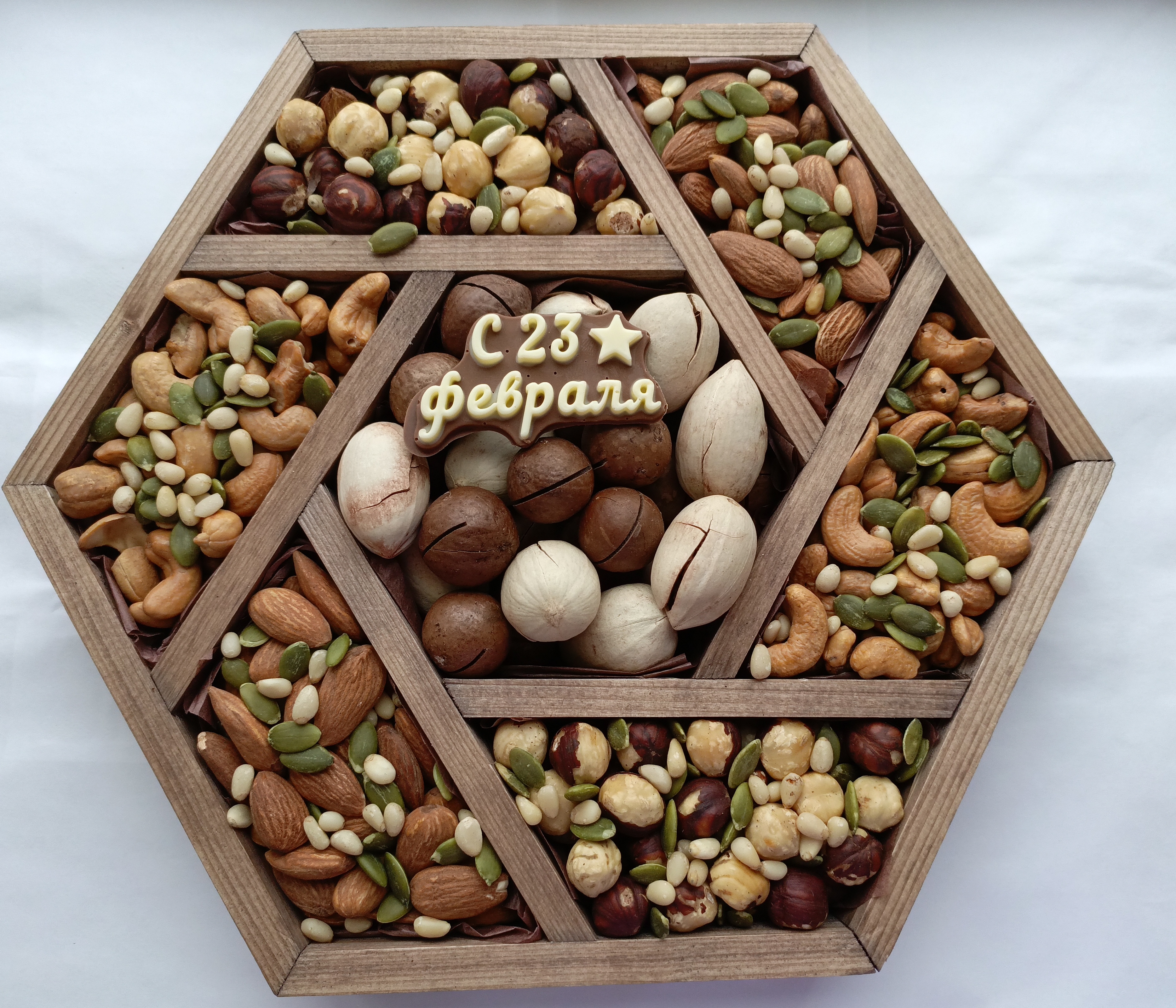 Вкусное поздравление из ассорти разных орехов, с дополнением шоколадной таблички " С 23 февраля"