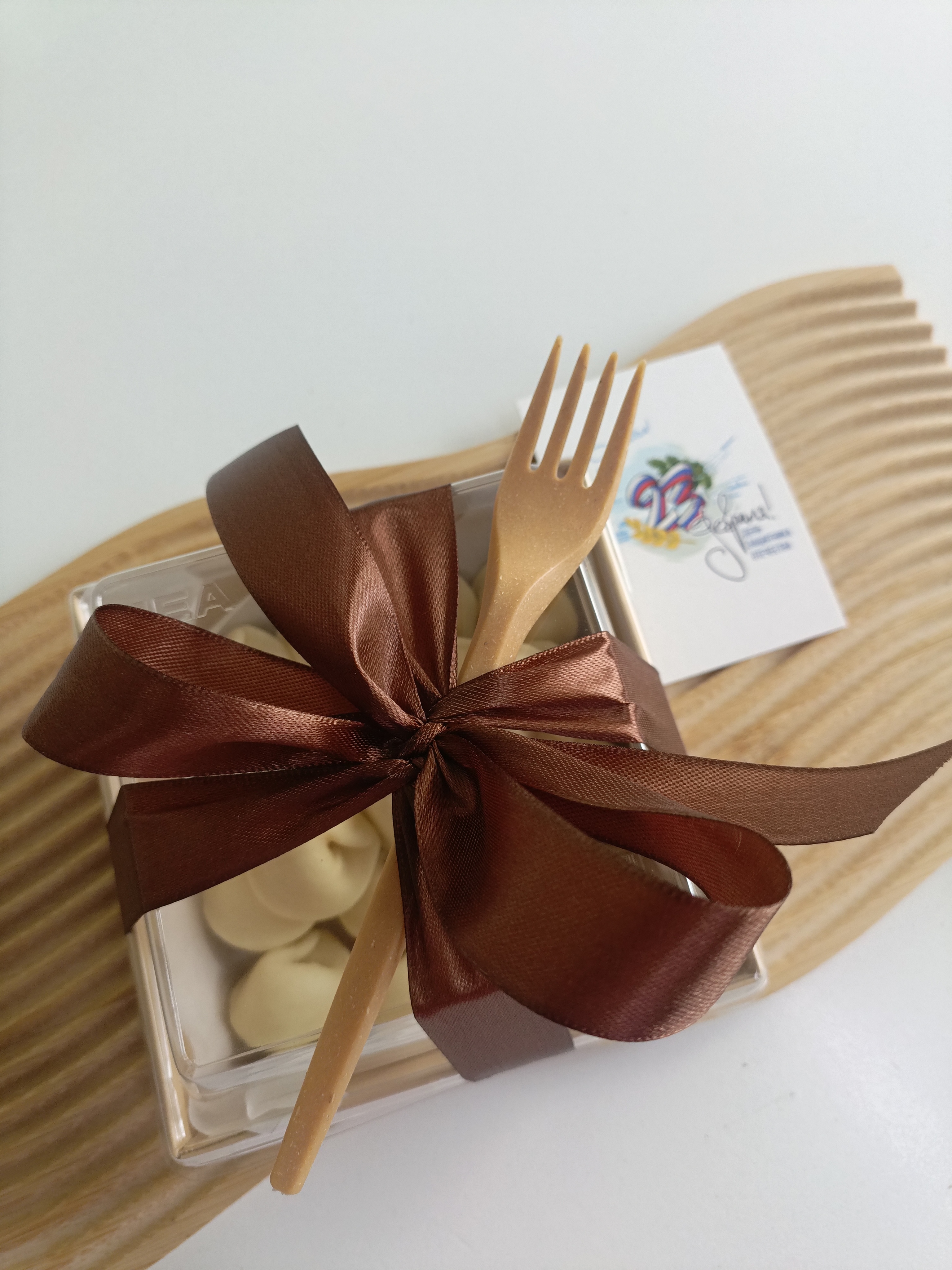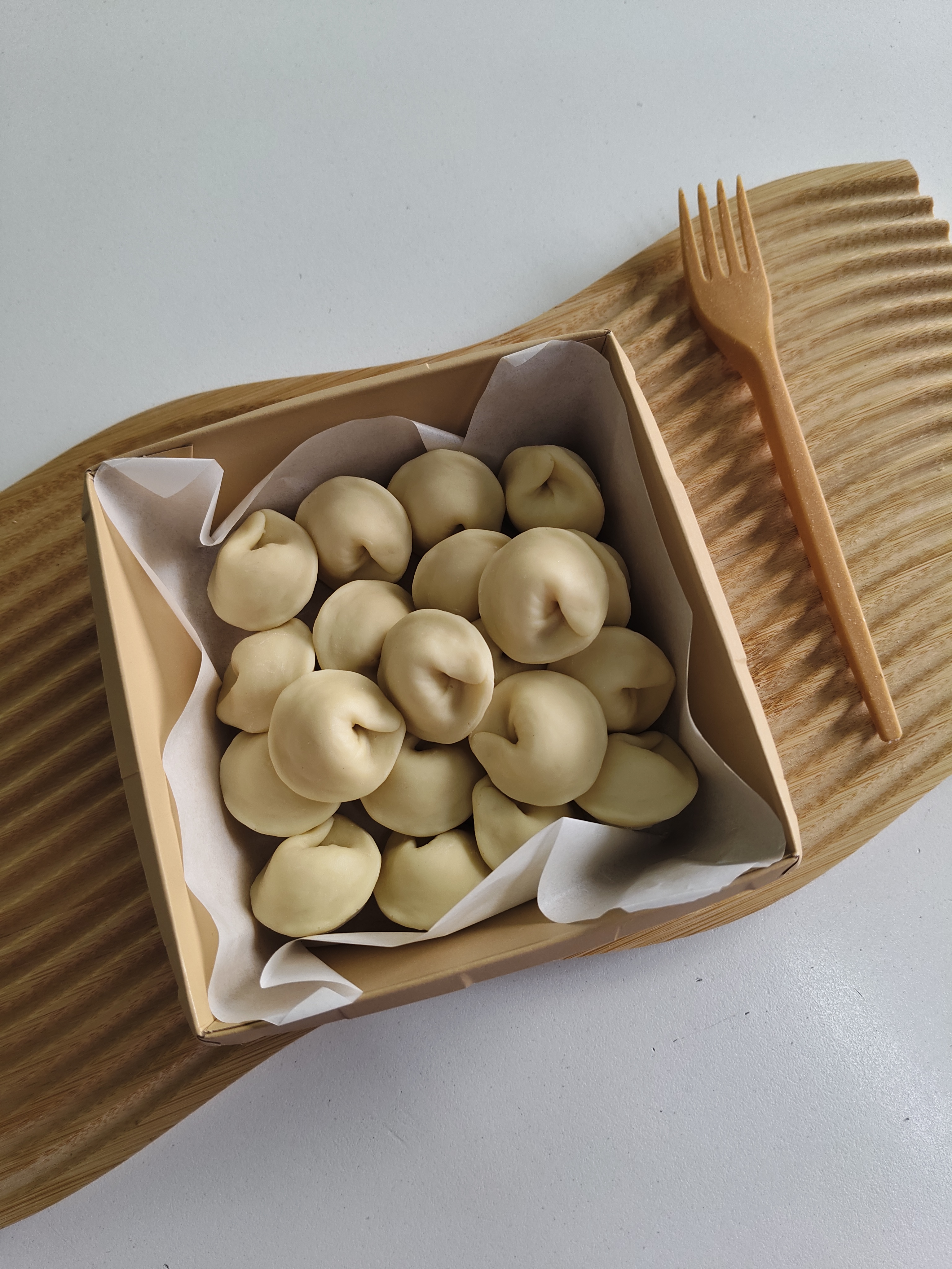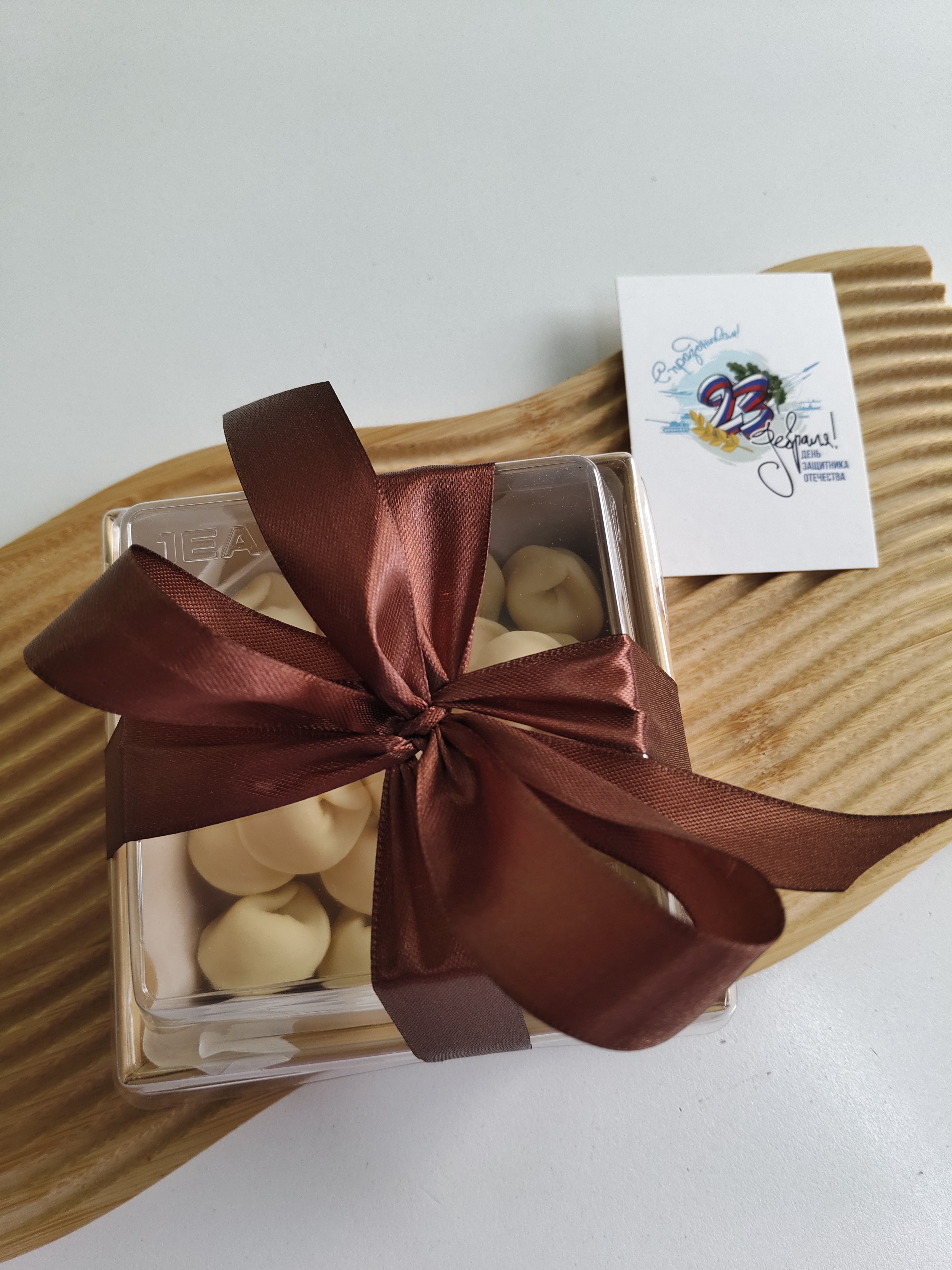 Состав: белый бельгийский шоколад Barry Callebaut,фундук обжаренный, в наборе 20 пельменей , вес 220 гр.