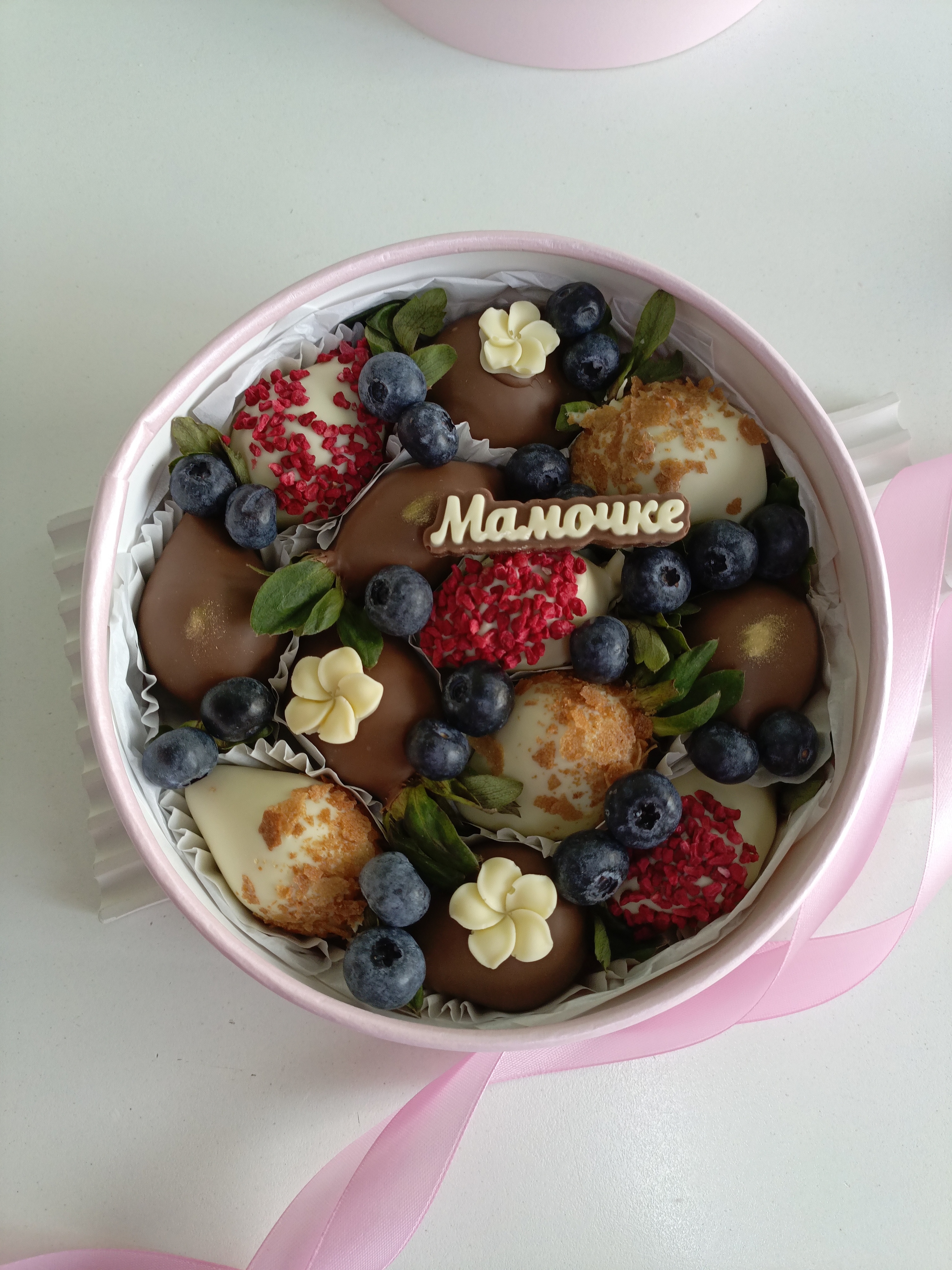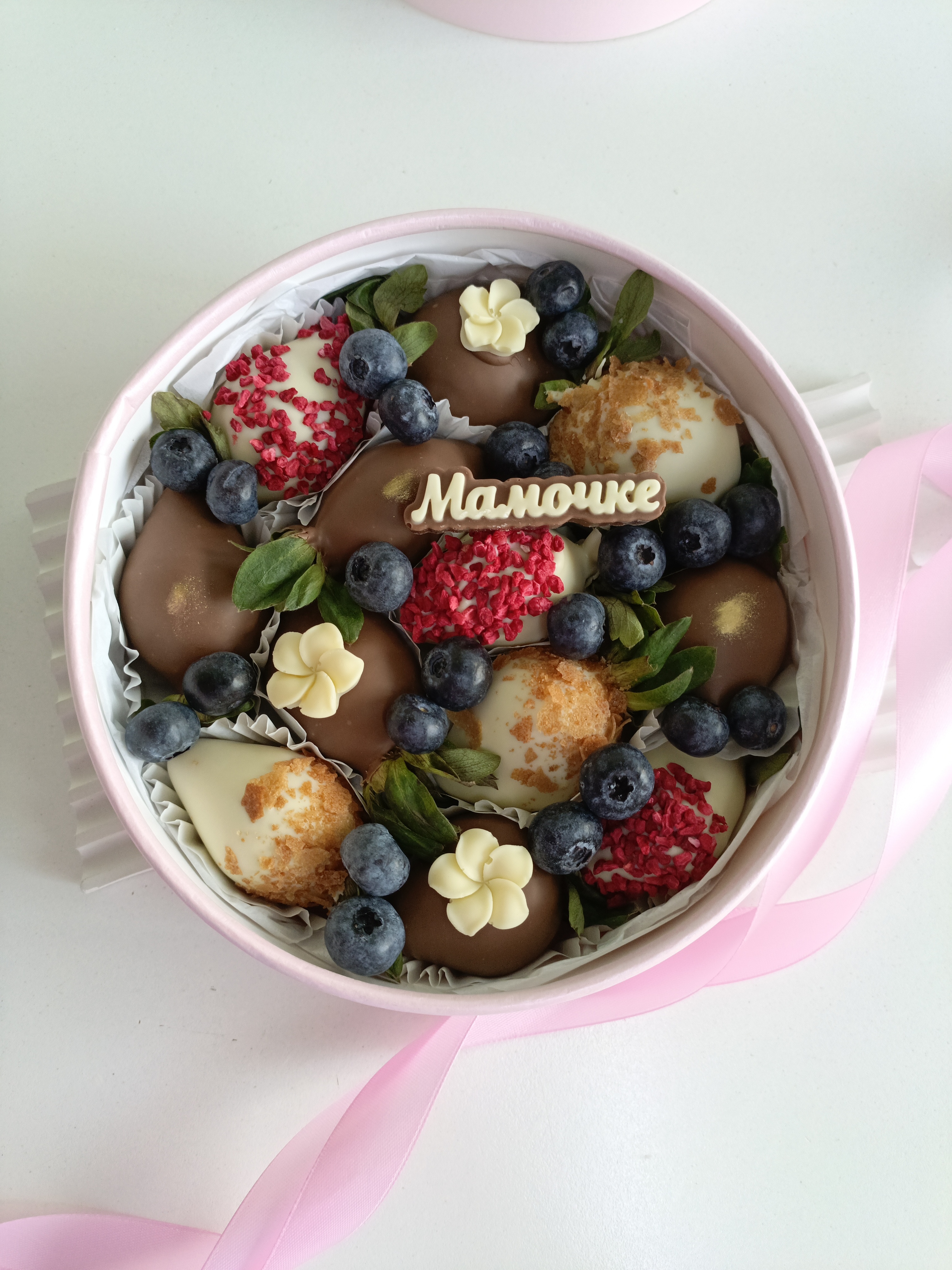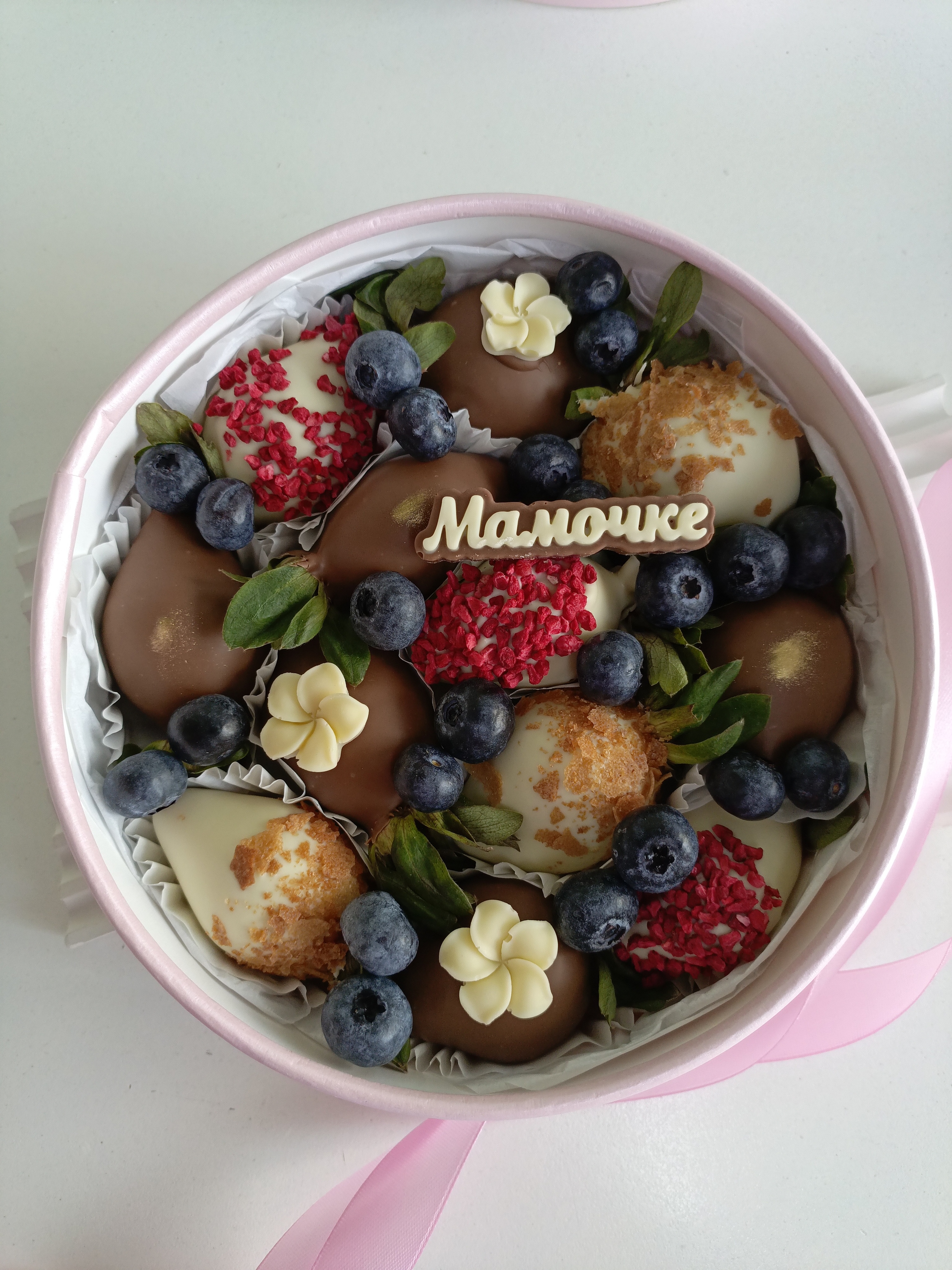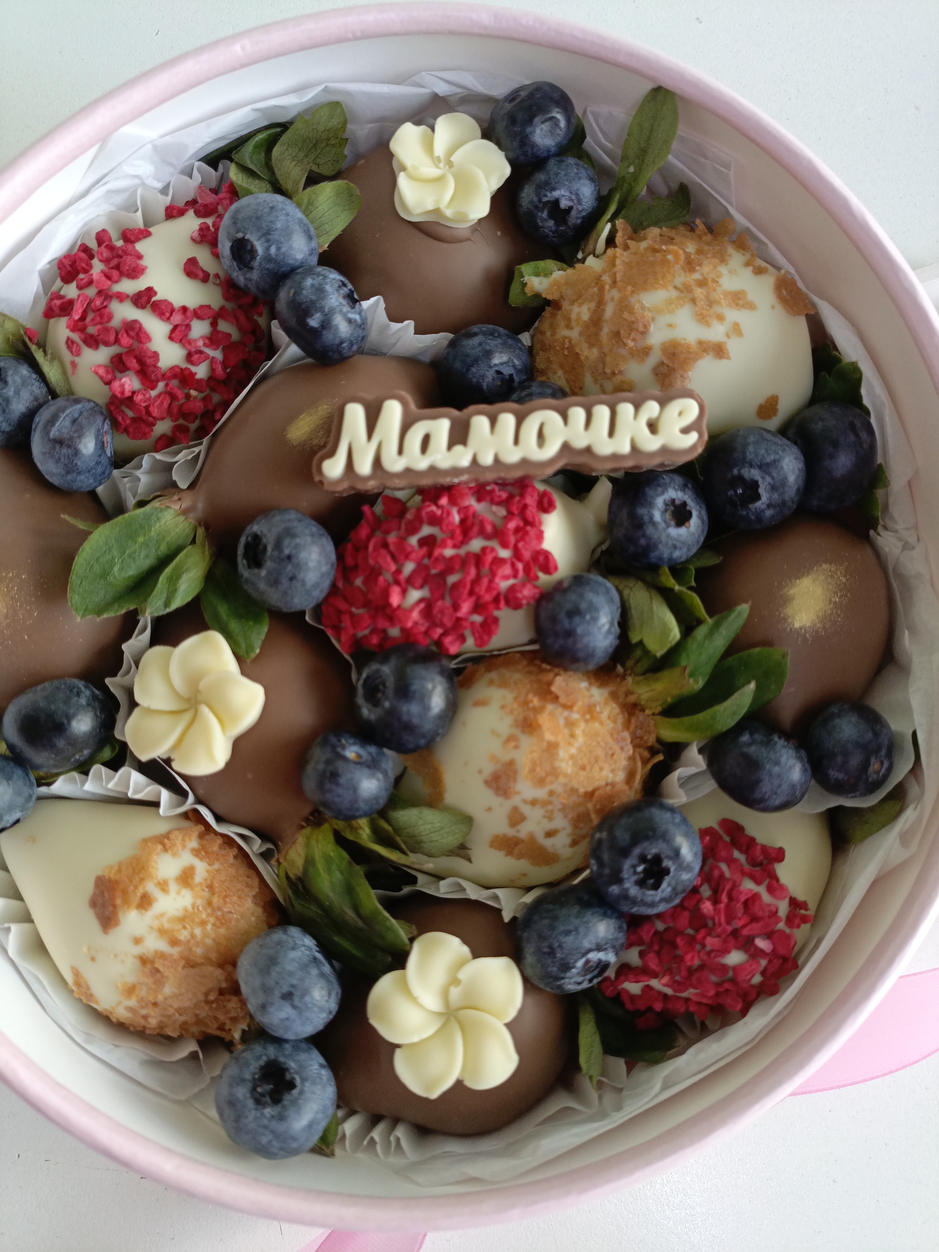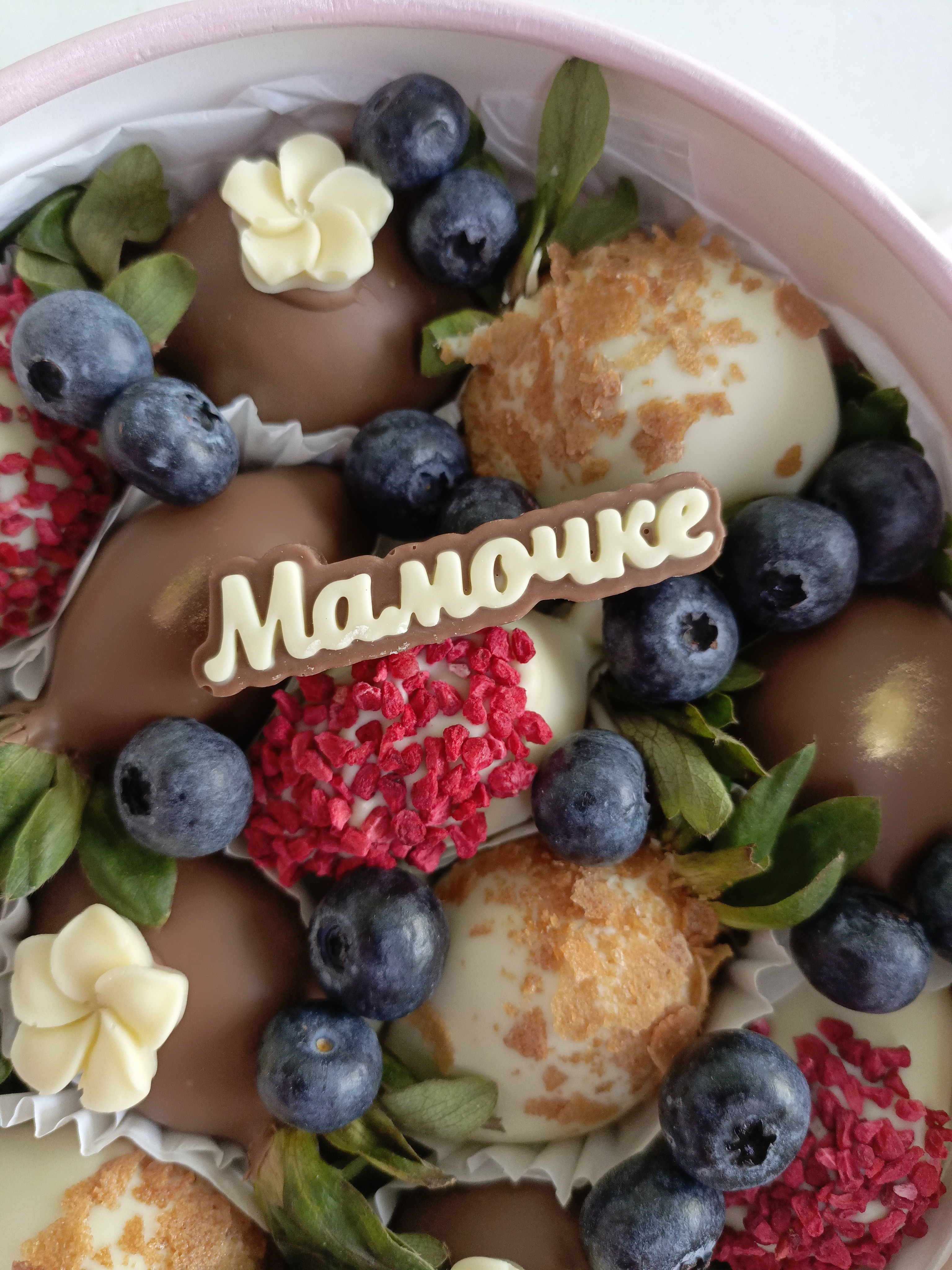 Дуэт белого и молочного шоколада с добавлением сублимированной малины и вафельной крошки , а также россыпи ягод голубики и табличка из шоколада " Мамочке"