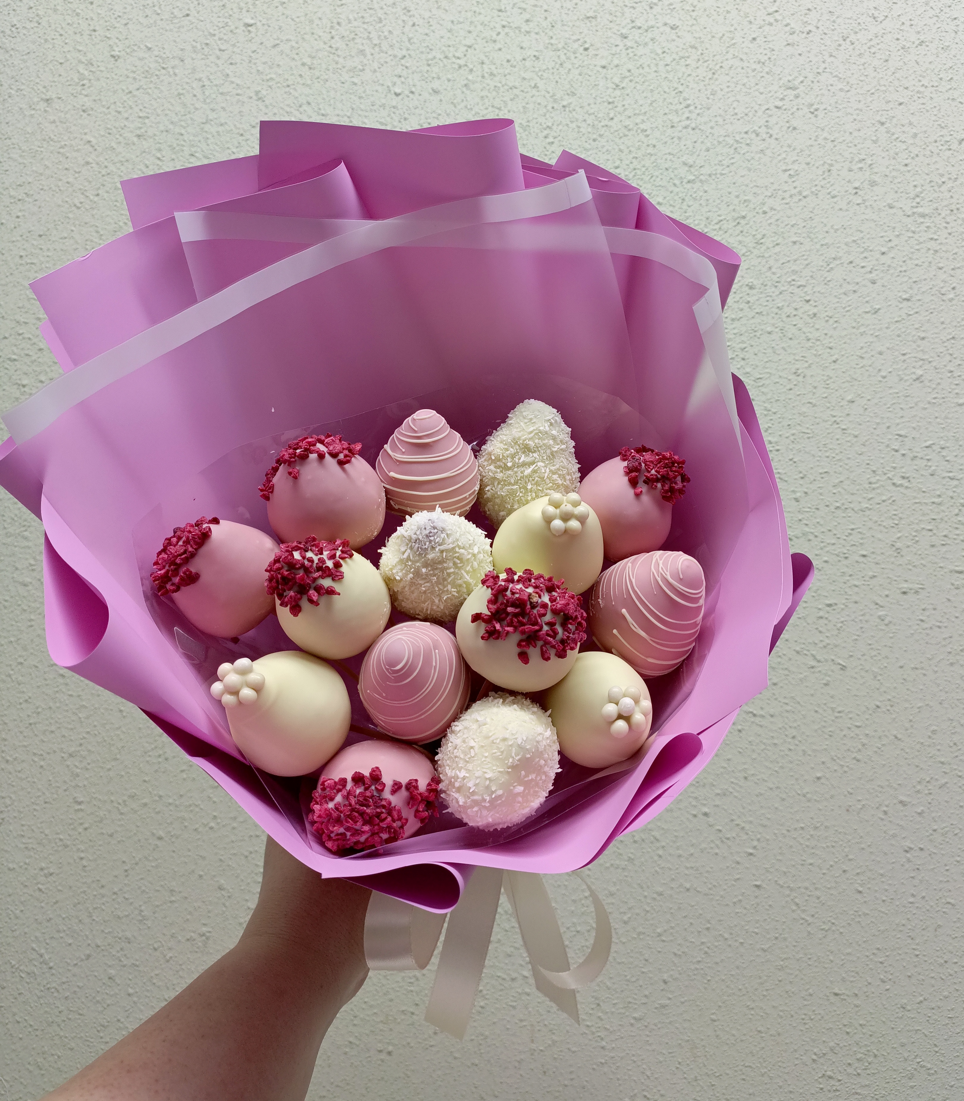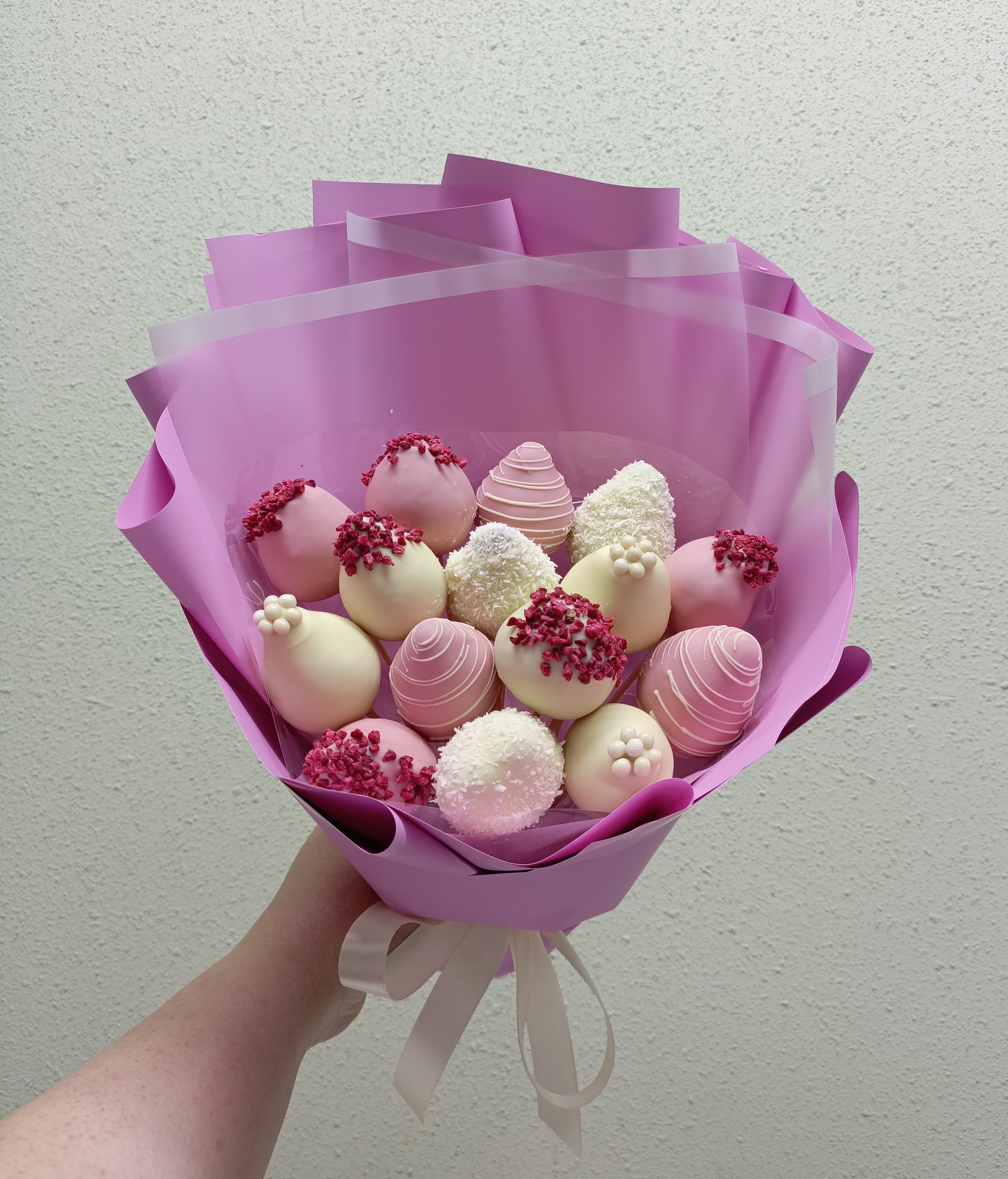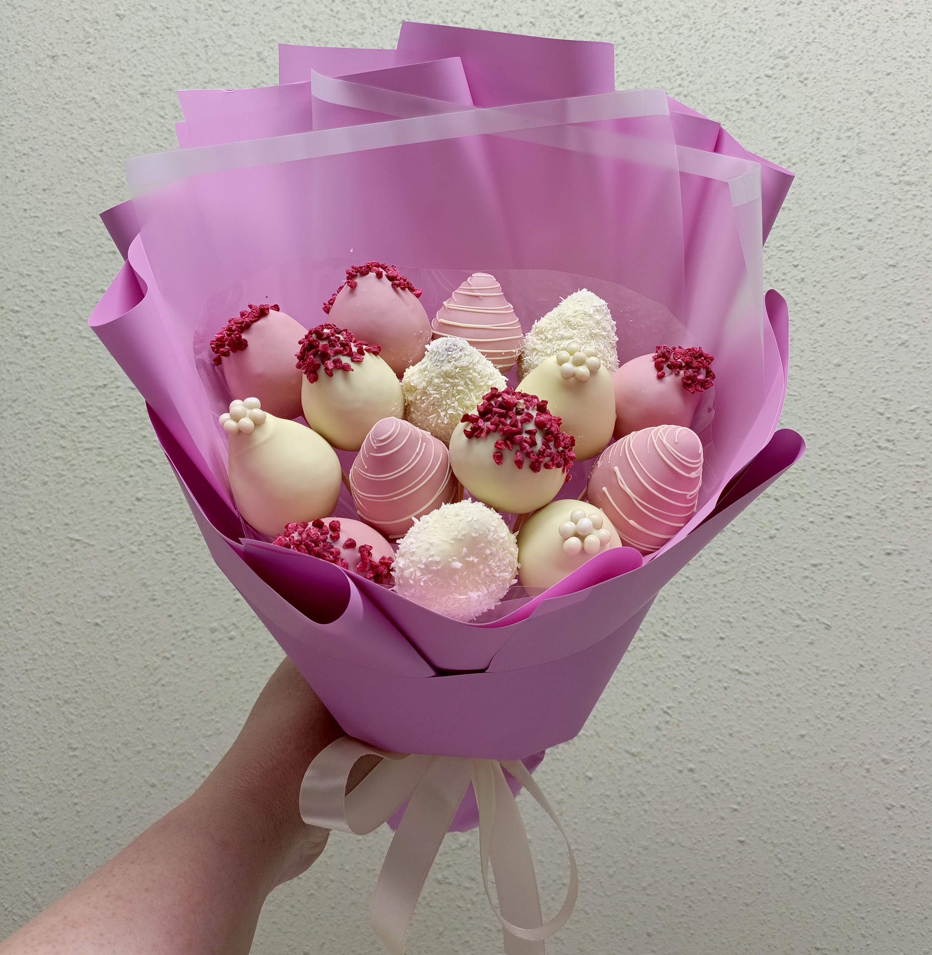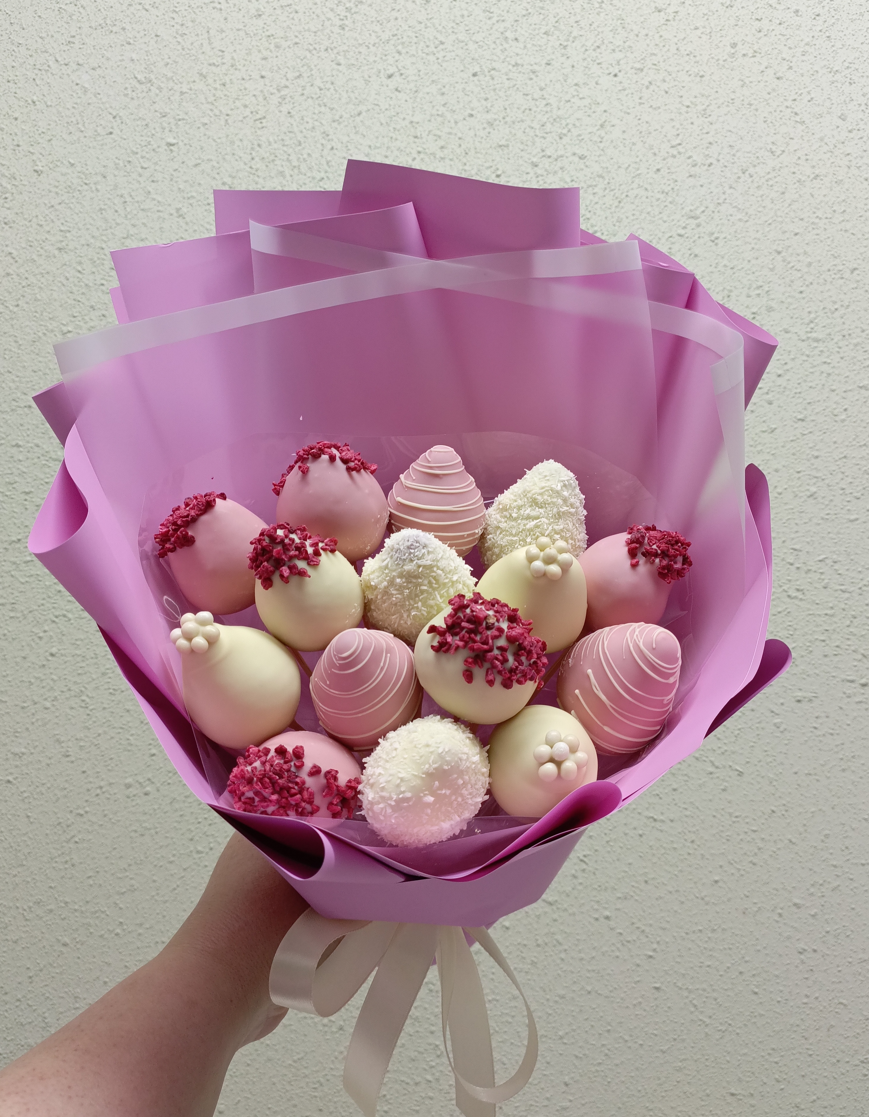 В букете 15 клубник в белом шоколаде с добавлением сублимированной малиной, шоколадных Криспи.