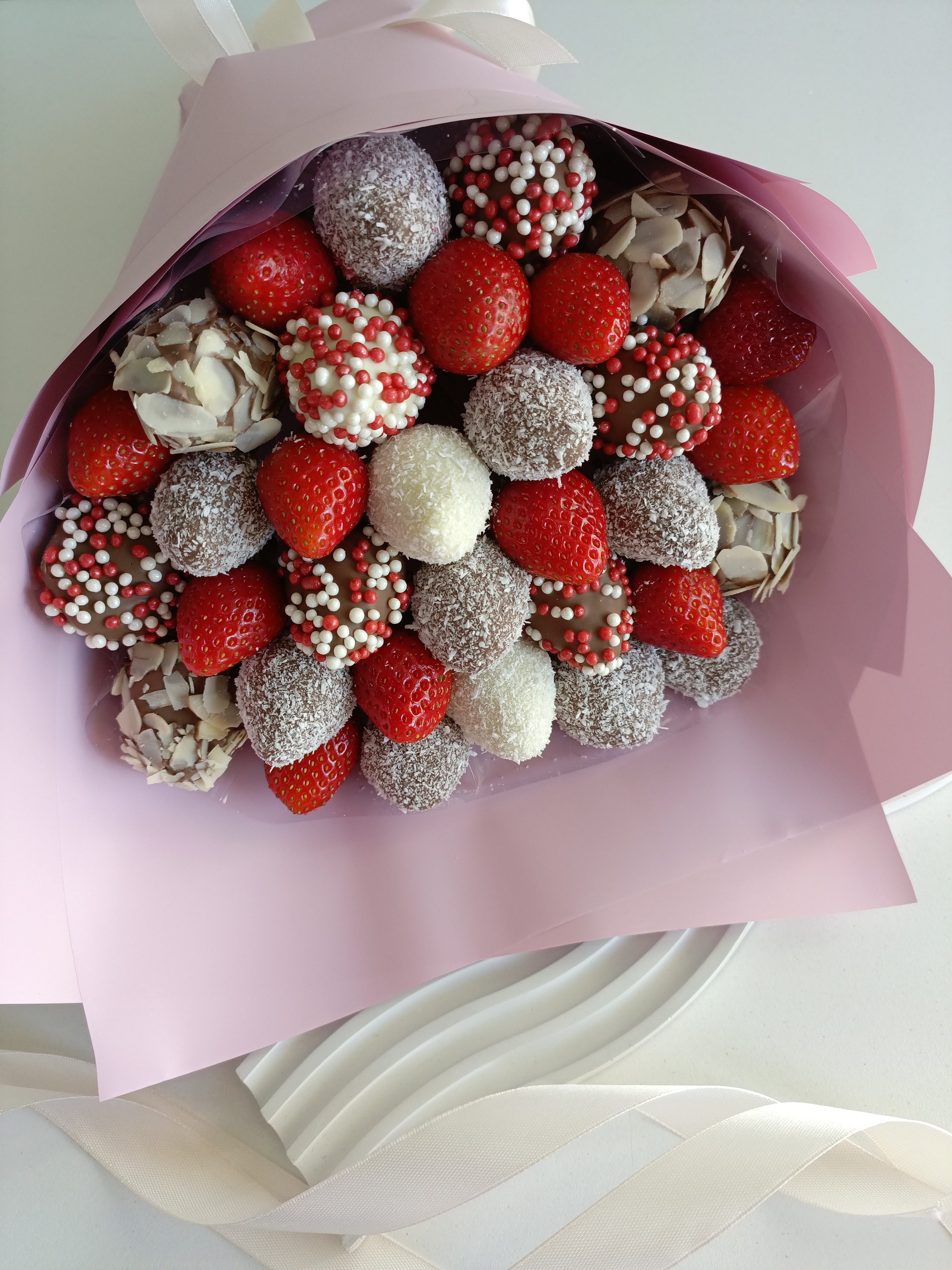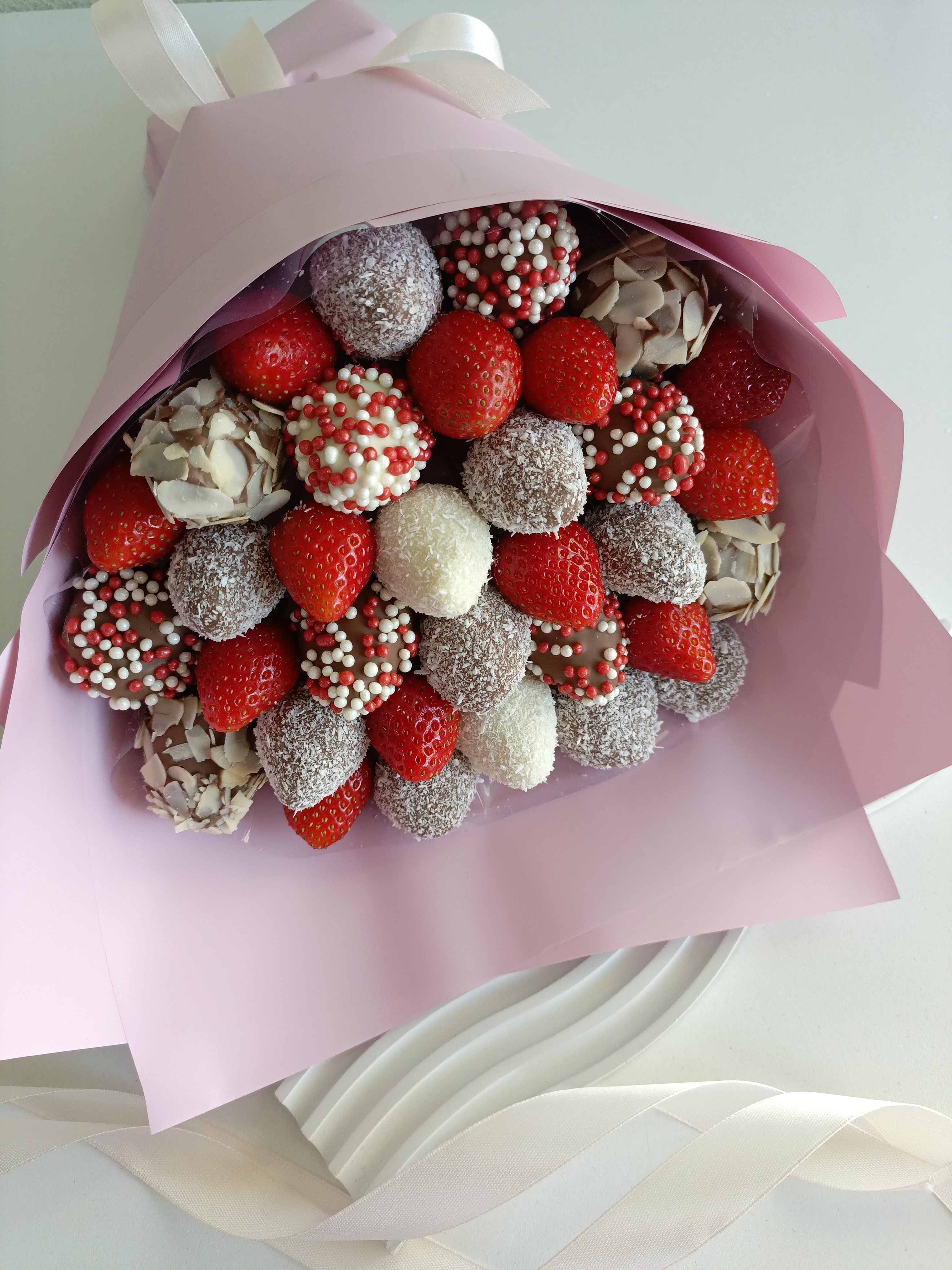 Состав: клубника свежая , шоколад молочный и белый, миндальные лепестки кокосовая стружка, рисовые шарики.