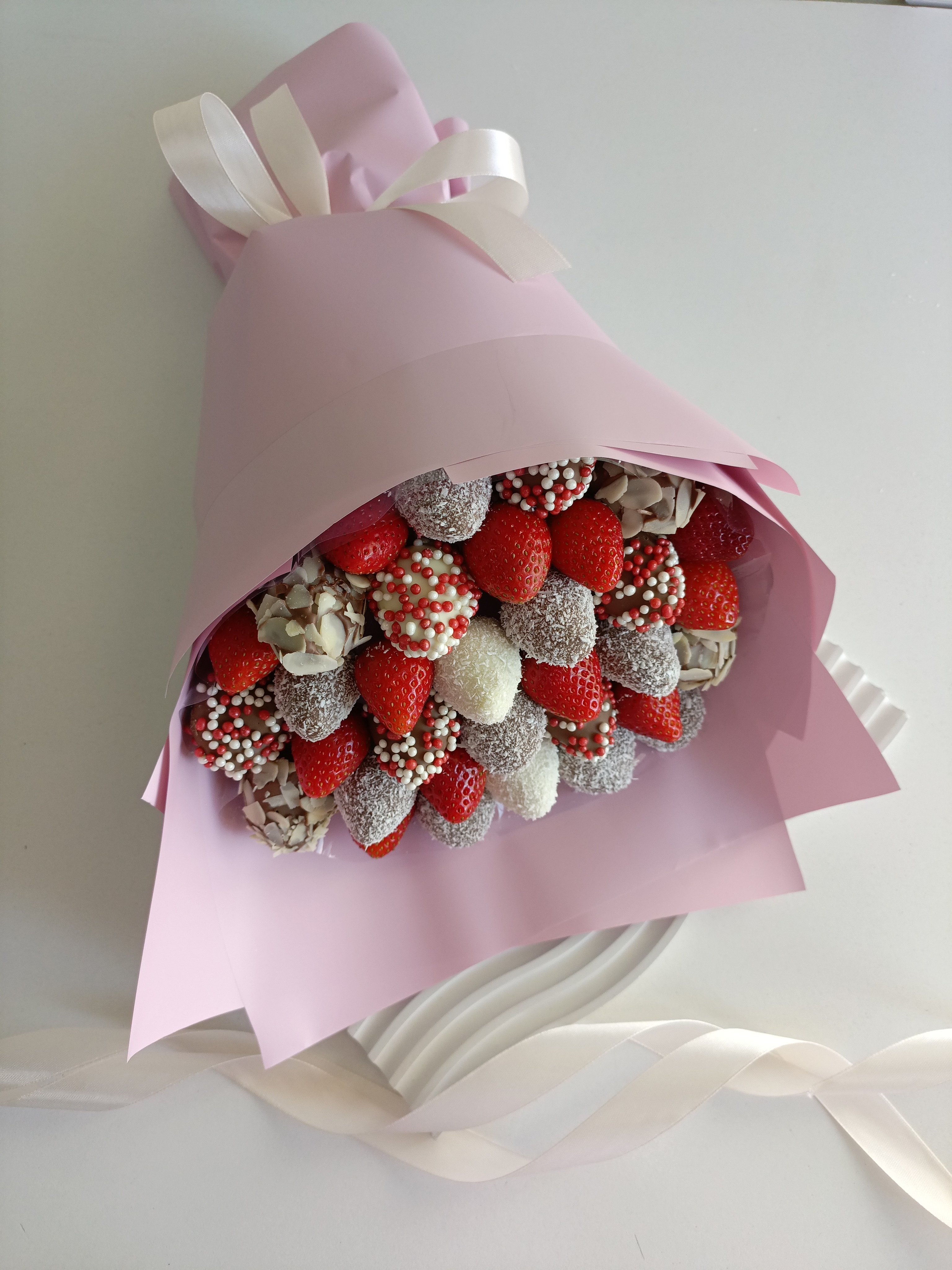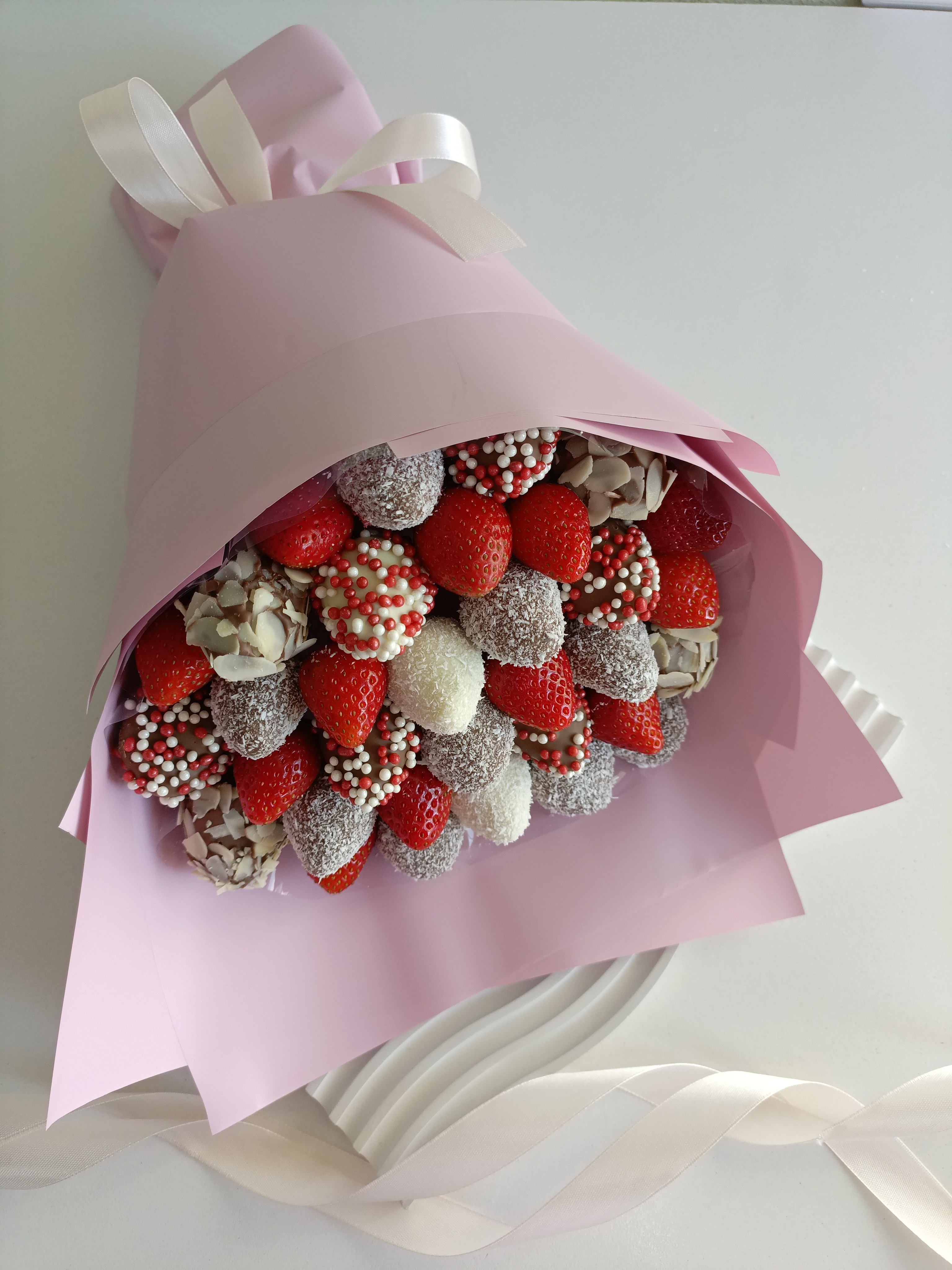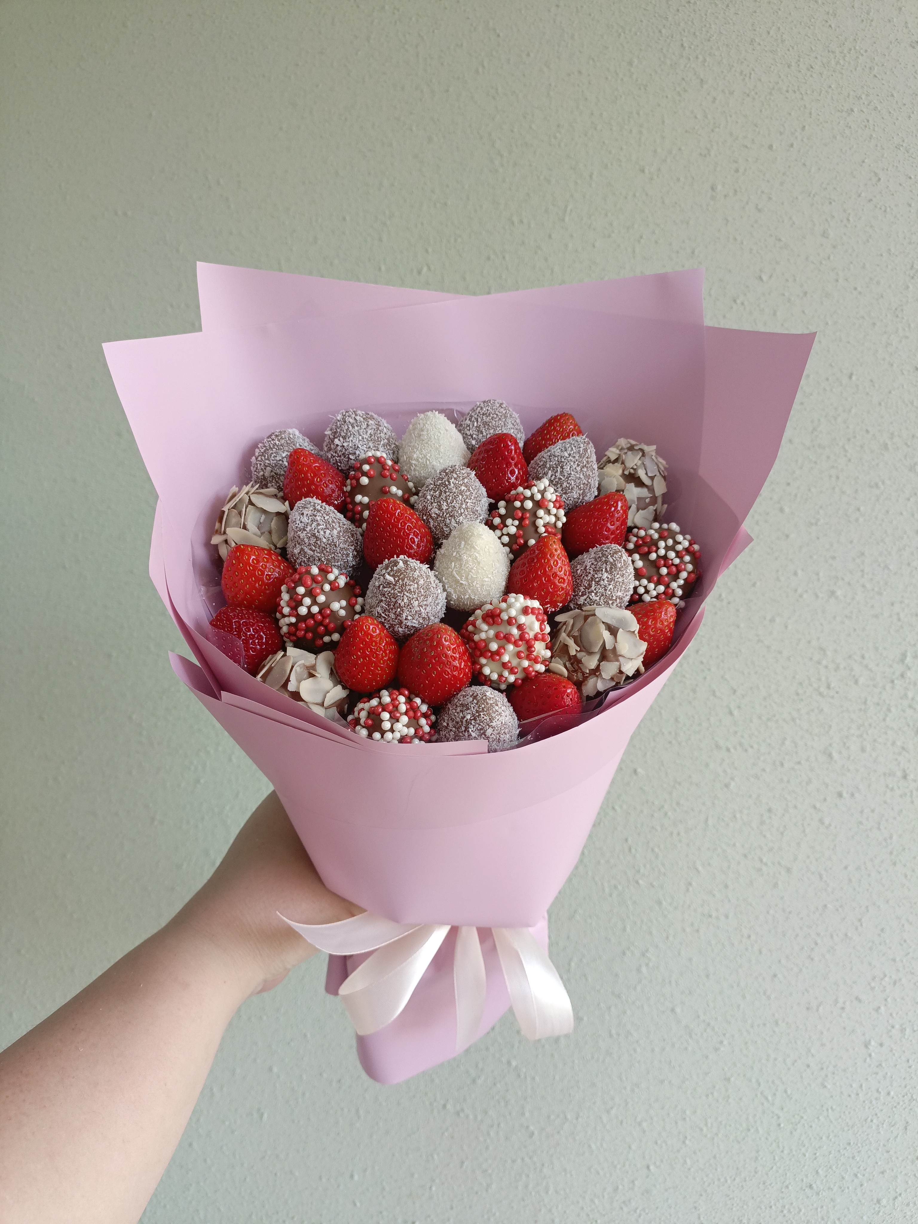 В букете сочетание клубники в бельгийском шоколаде и свежих ягод клубники.