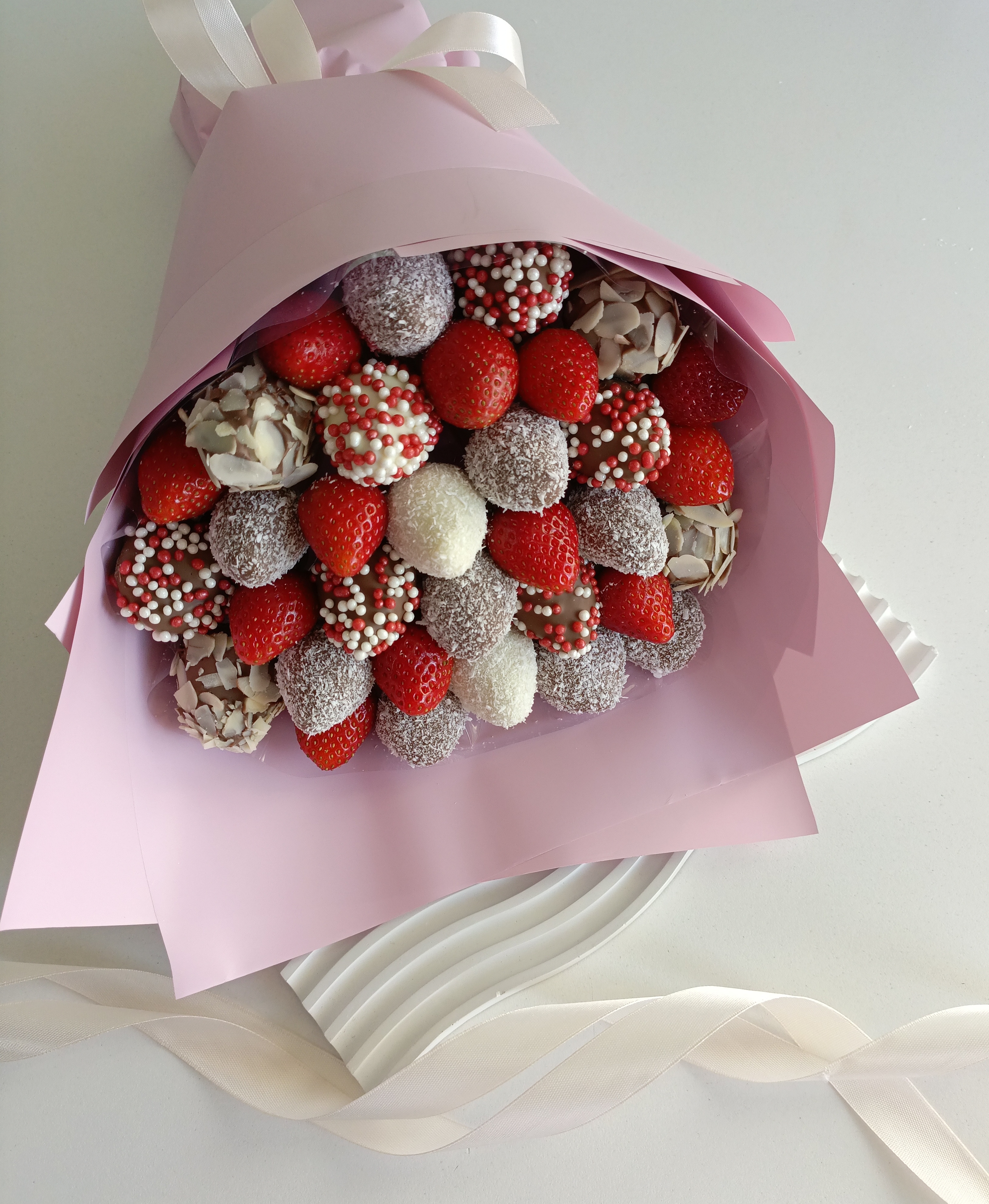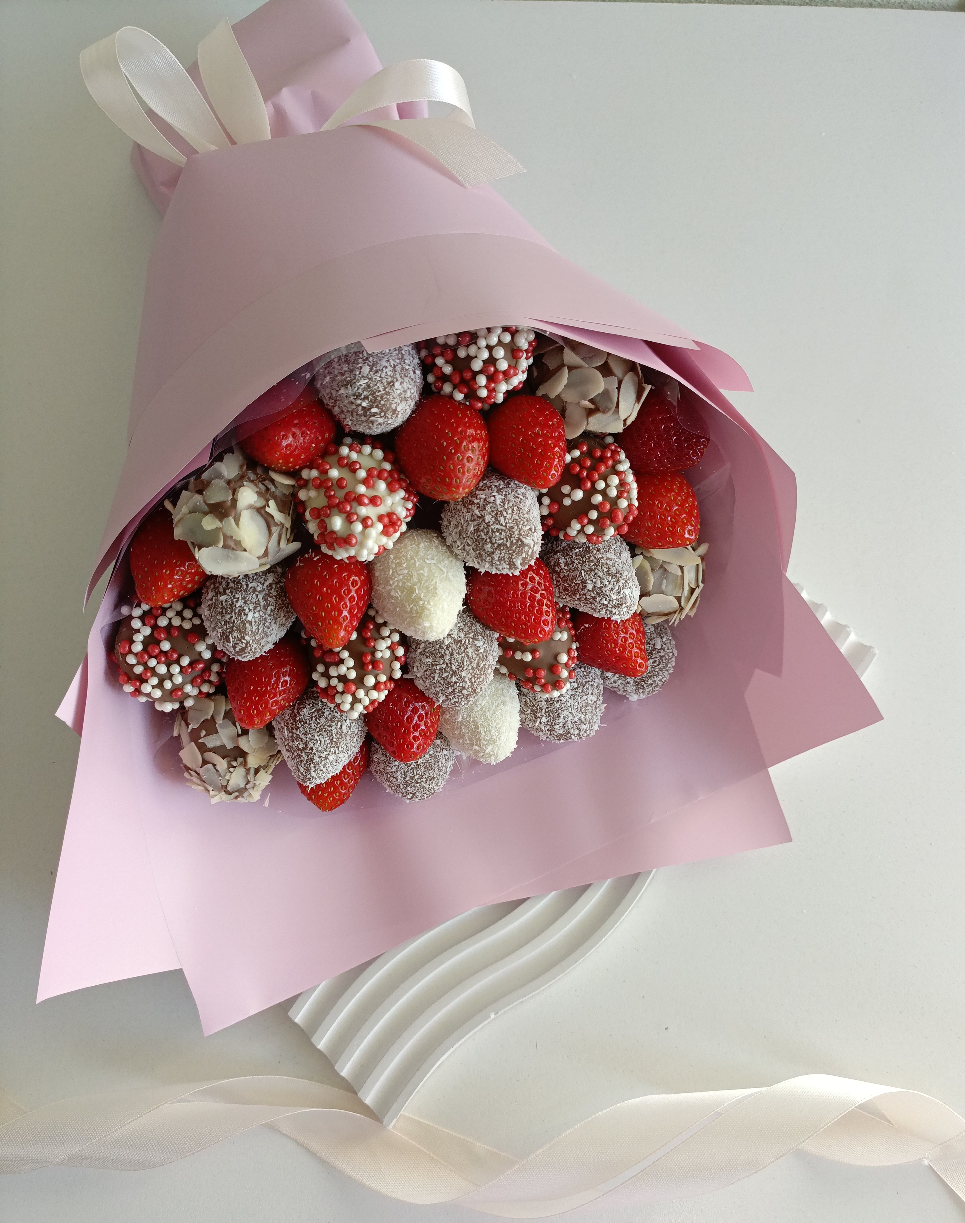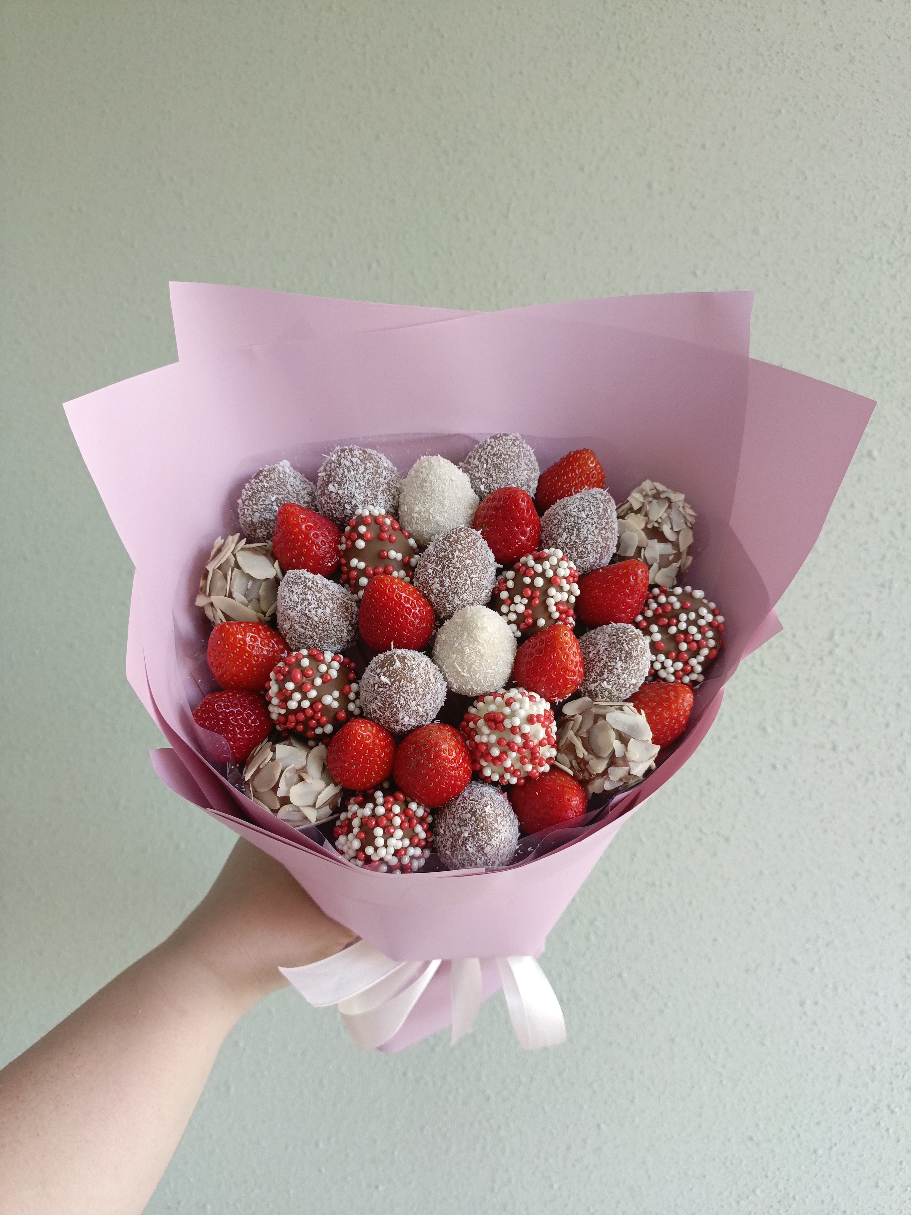 В букете сочетание клубники в бельгийском шоколаде и свежих ягод клубники.