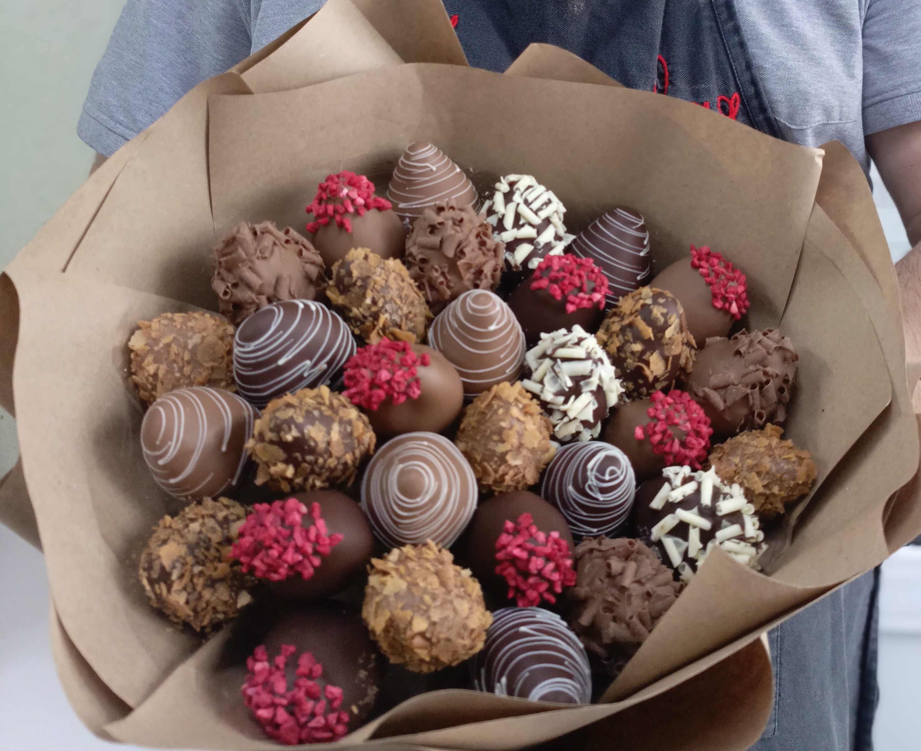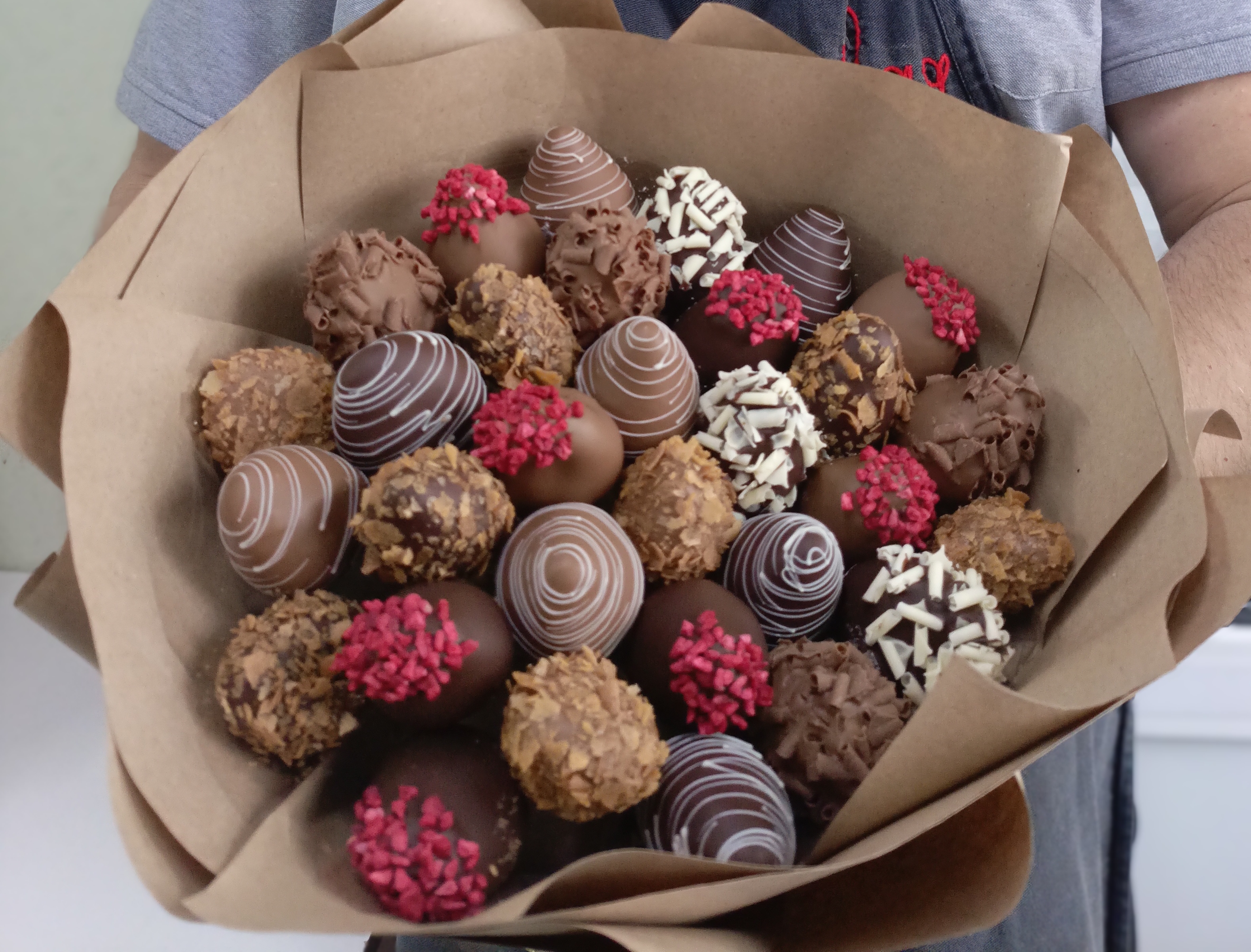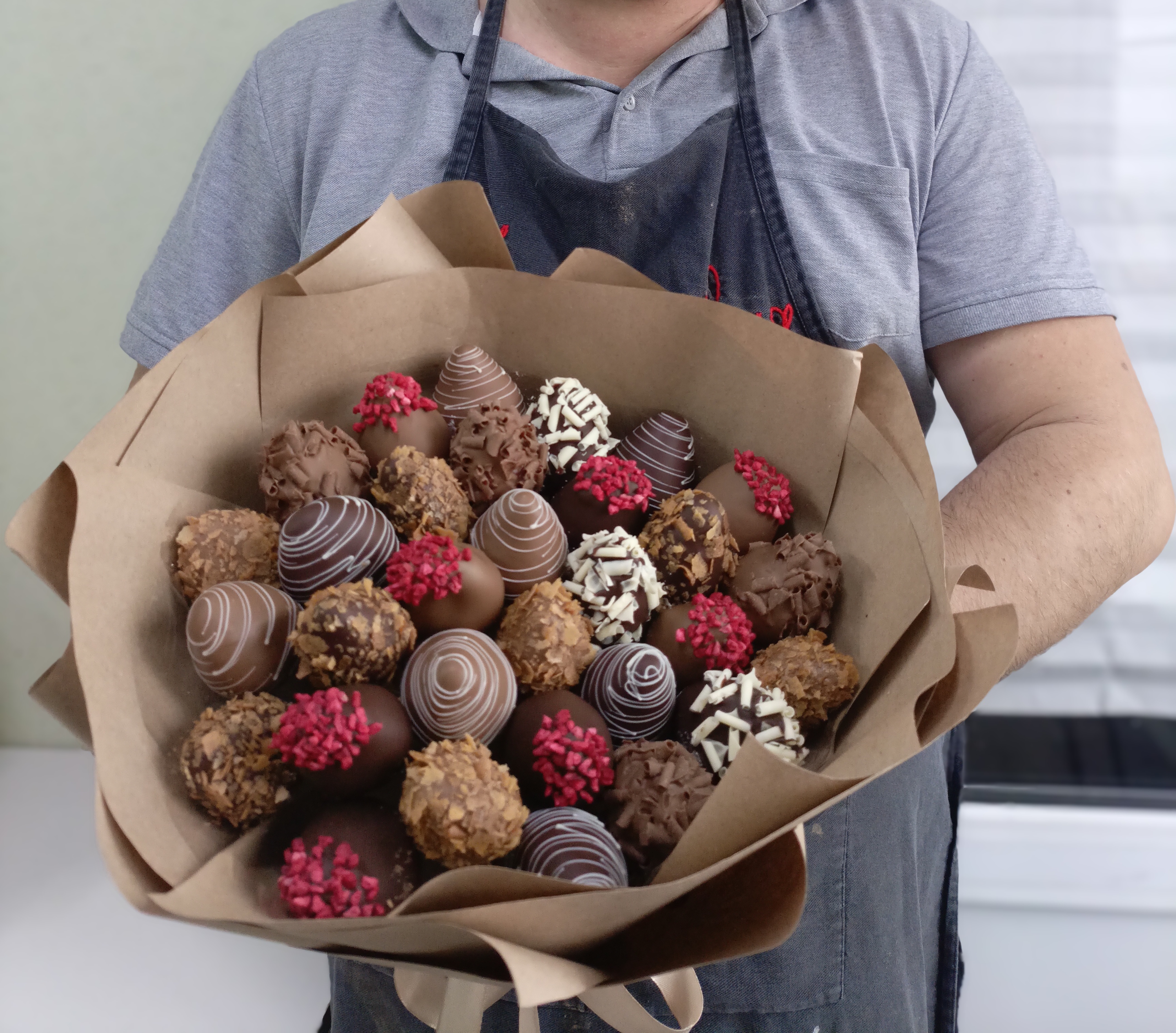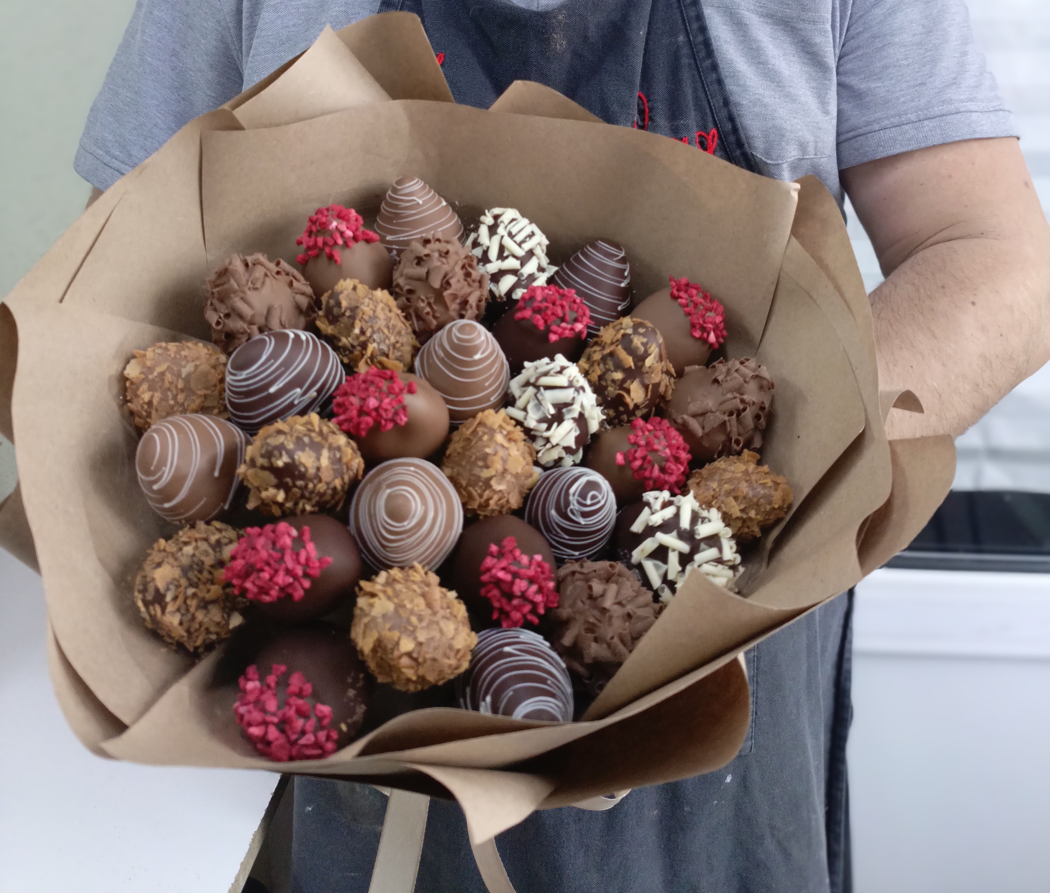 В букете 32-35 клубник, молочный и темный бельгийский шоколад, малина сублимированная, вафельная крошка, шоколадная стружка.