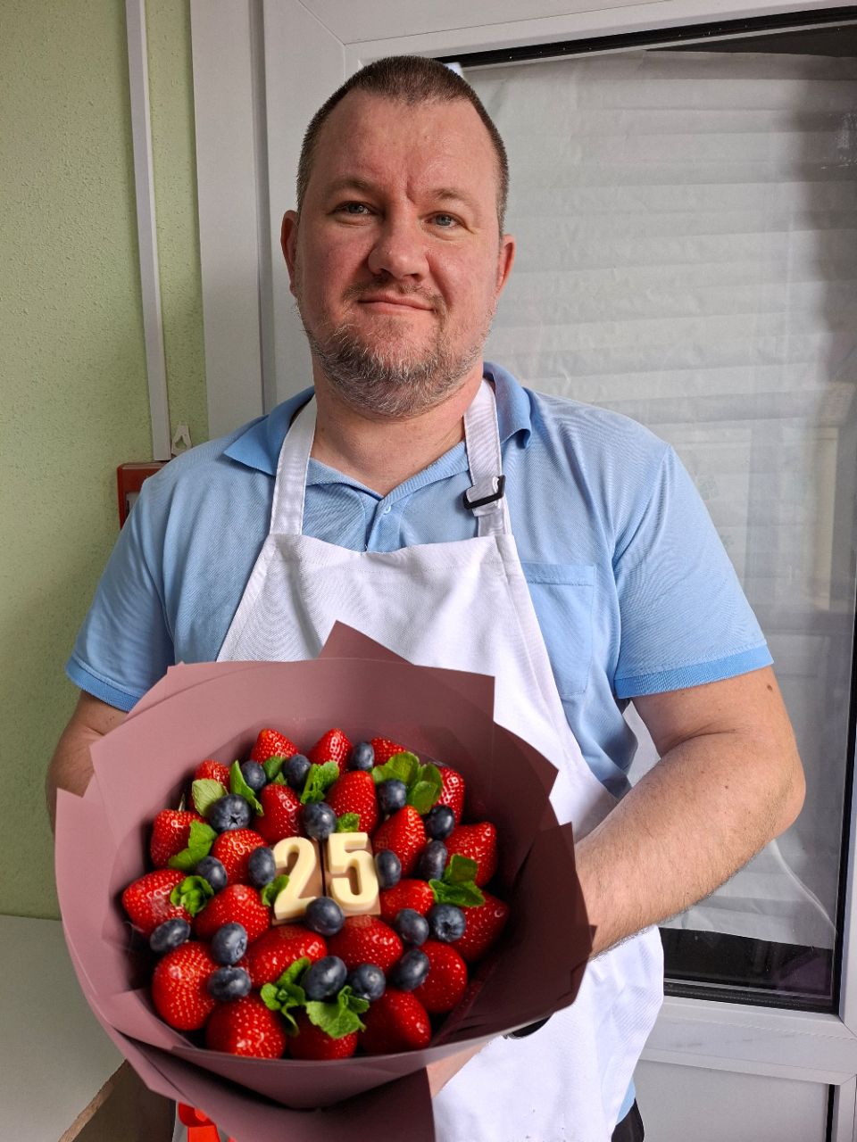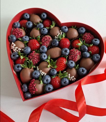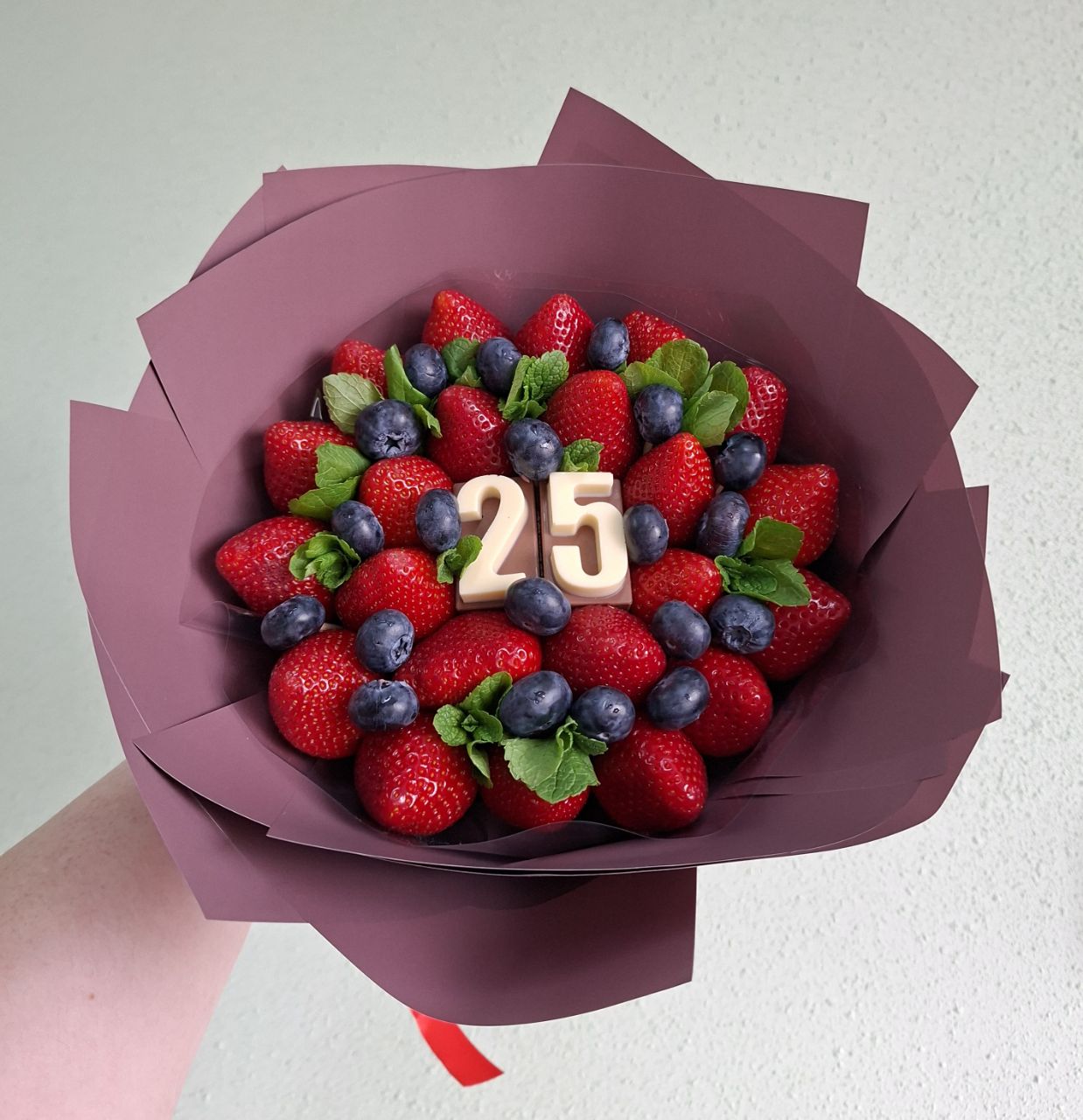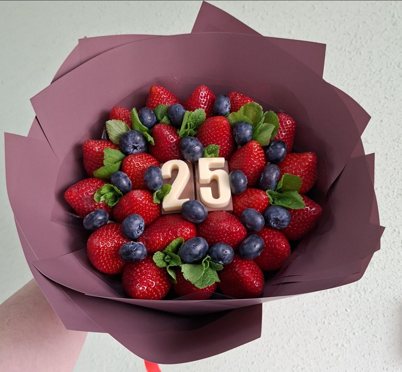 Красивый и вкусный букет из ягод клубники и голубики с шоколадными цифрами и мятой .
