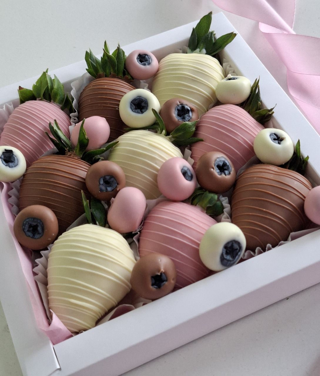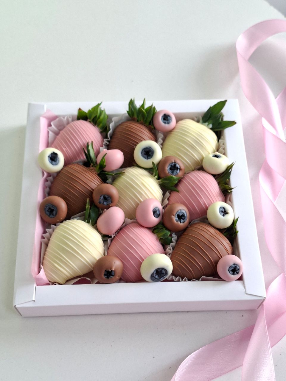 Состав клубника свежая, голубика свежая, шоколад премиальный бельгийский Barry Callebaut, краситель пищевой розовый.