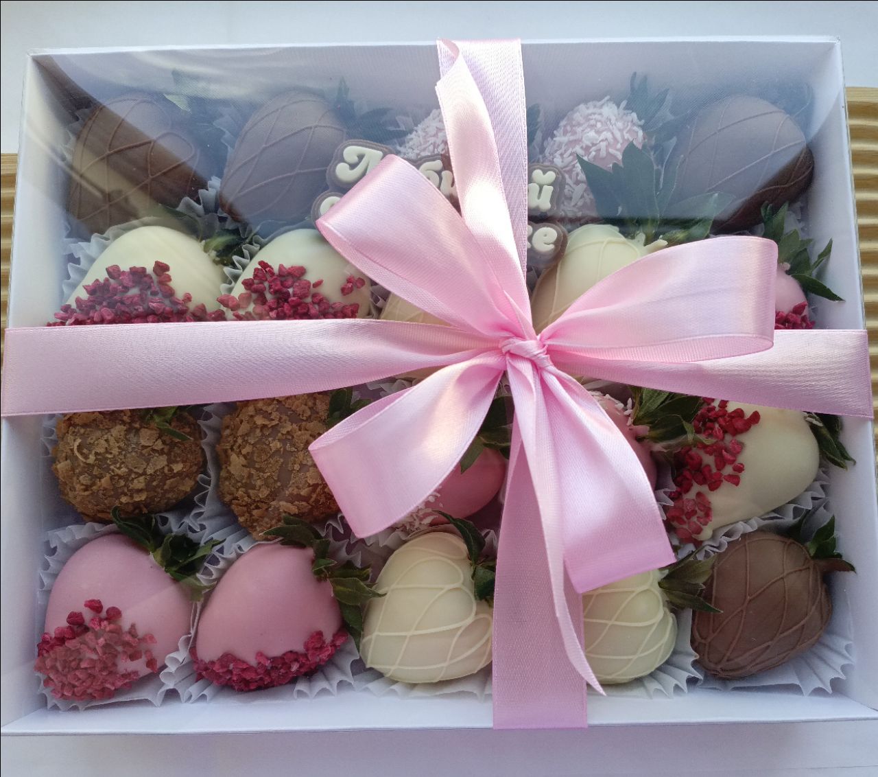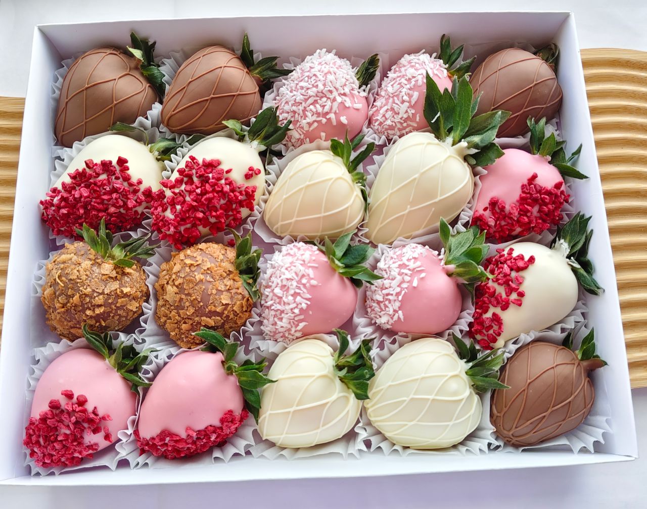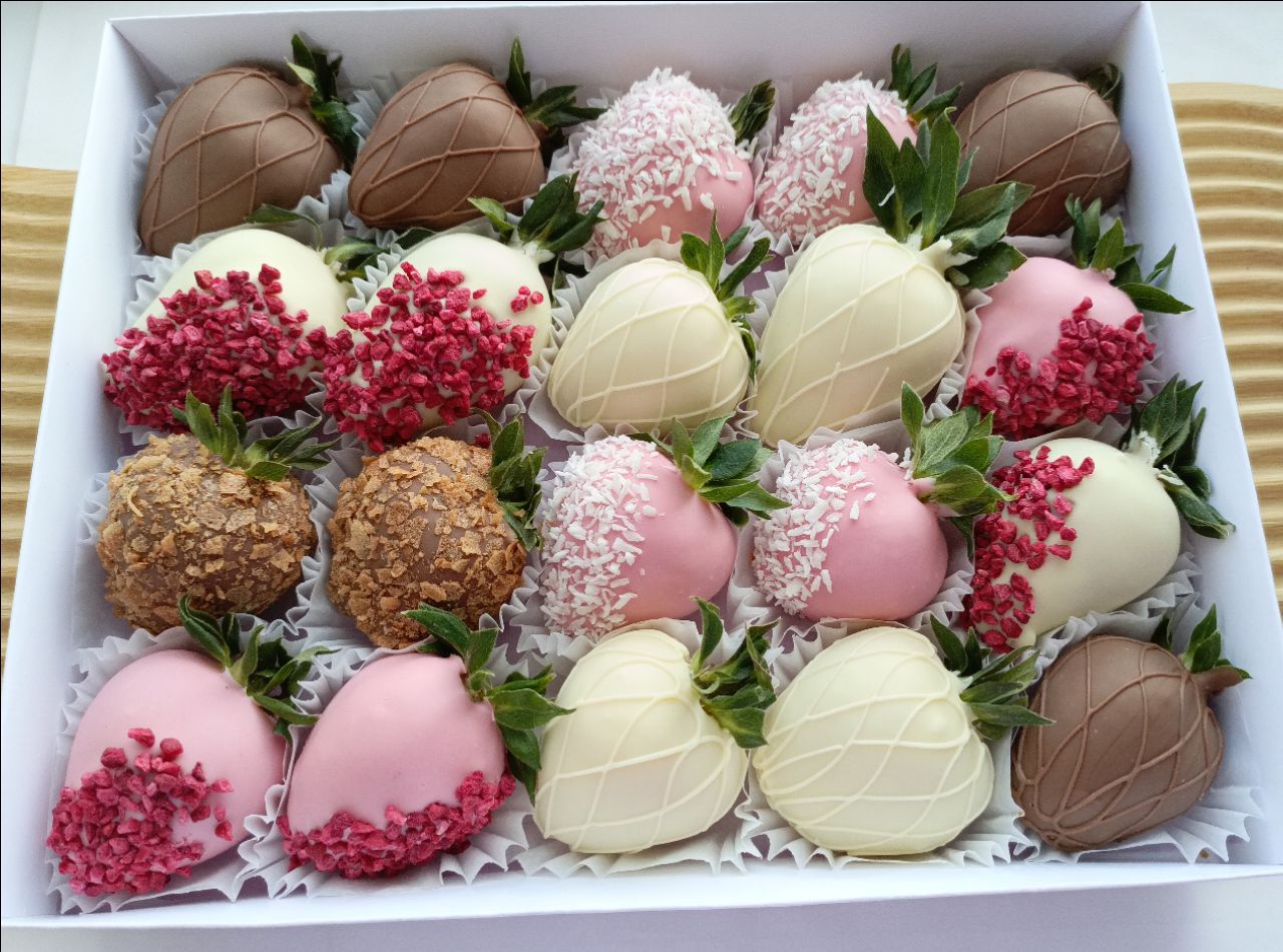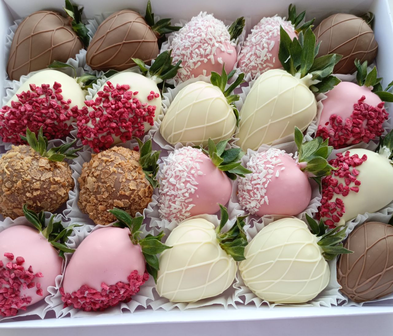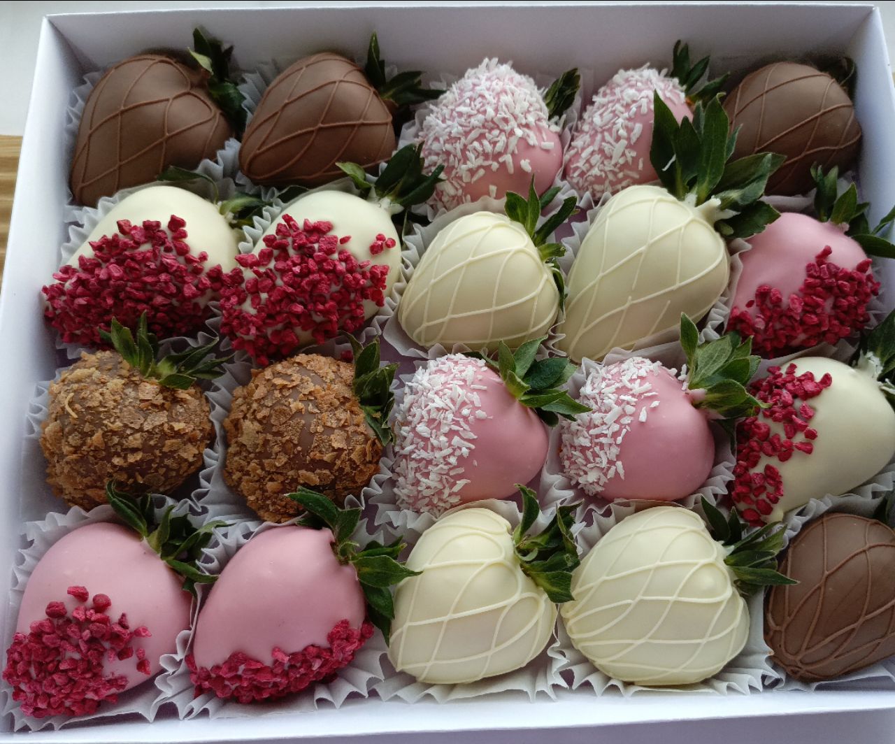 Шикарный, вкусный, красивый набор из клубники в шоколаде,три вида шоколада: белый , розовый и молочный, вкусная ягода свежей клубники и посыпки из сублимированной малины, вафельной крошки и кокосовой стружки.