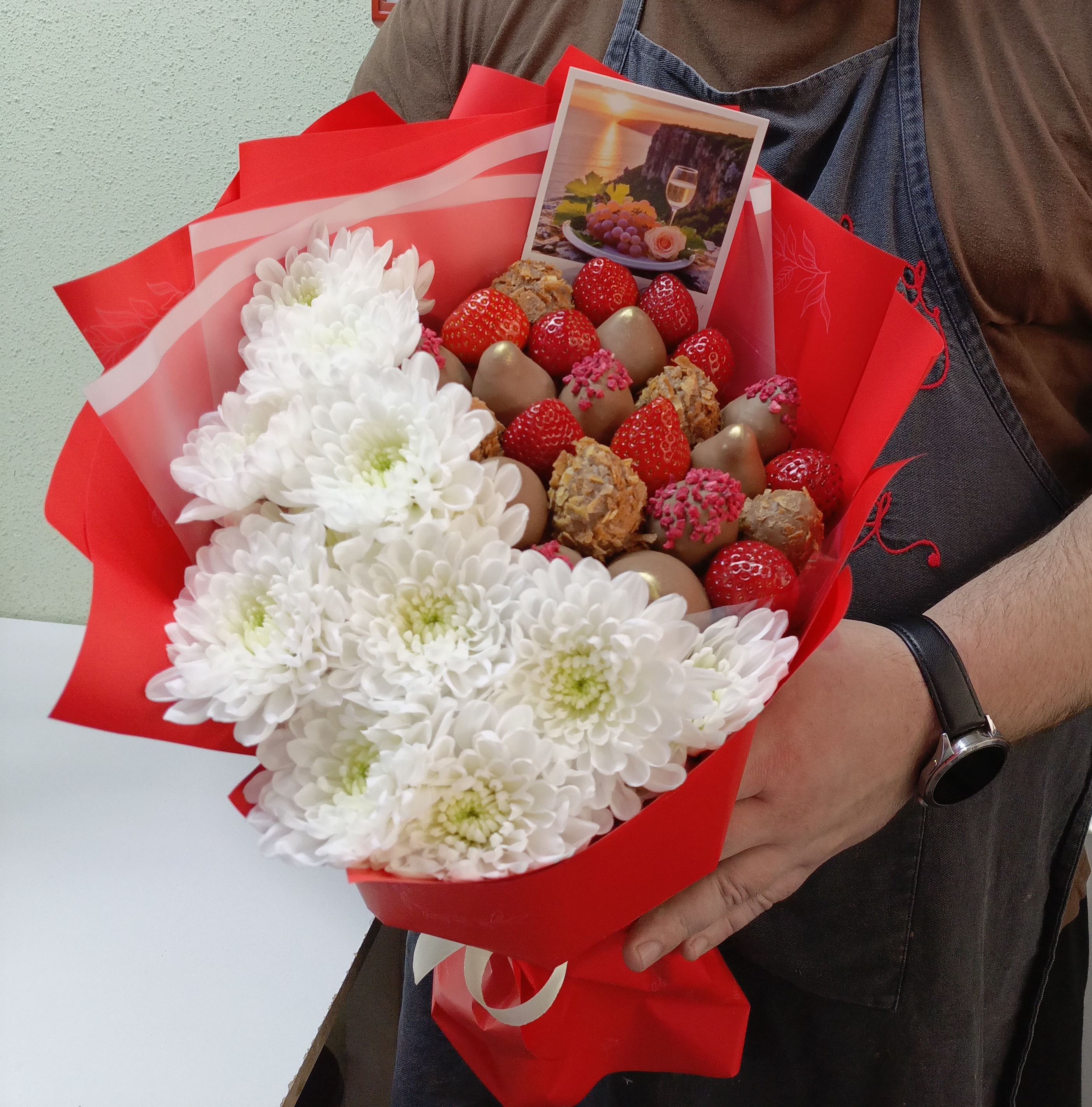 Побалуйте себя роскошным букетом от нашего магазина! Хризантема символизирует счастье и радость, а клубника в шоколаде добавляет нотку сладости и утонченности. Наш продукт станет идеальным подарком по любому поводу. Закажите прямо сейчас и наслаждайтесь вкусом свежей клубники в сочетании шоколадом – истинное удовольствие для гурманов!